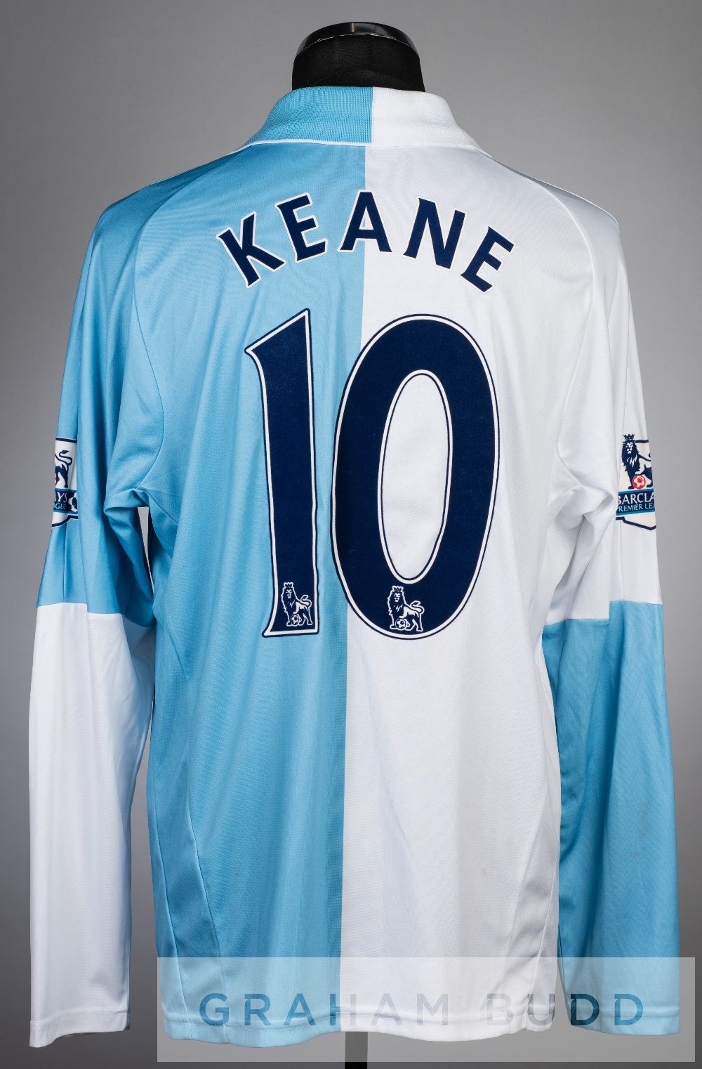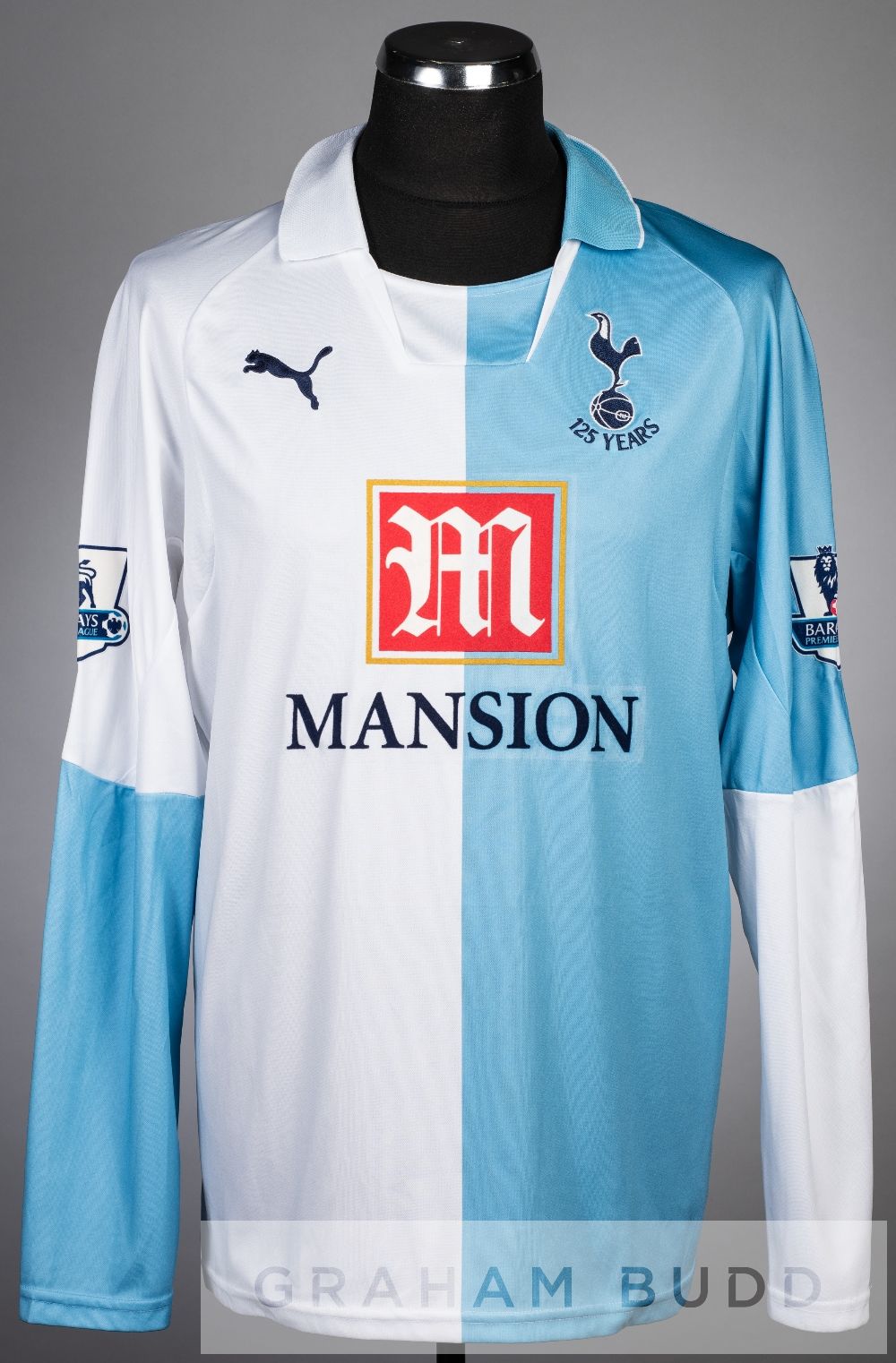 Robbie Keane white and pale blue Tottenham Hotspur 125 Years anniversary no.10 jersey v Aston Villa at White Hart Lane, 1st October 2007, spare long-sleeved with BARCLAYS PREMIER LEAGUE sleeve badges, club crest and sponsor logo, reverse lettered KEANE This fixture resulted in a 4-4 draw, with Robbie Keane scoring a penalty in the 82nd minute.