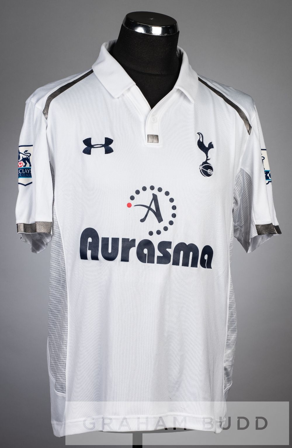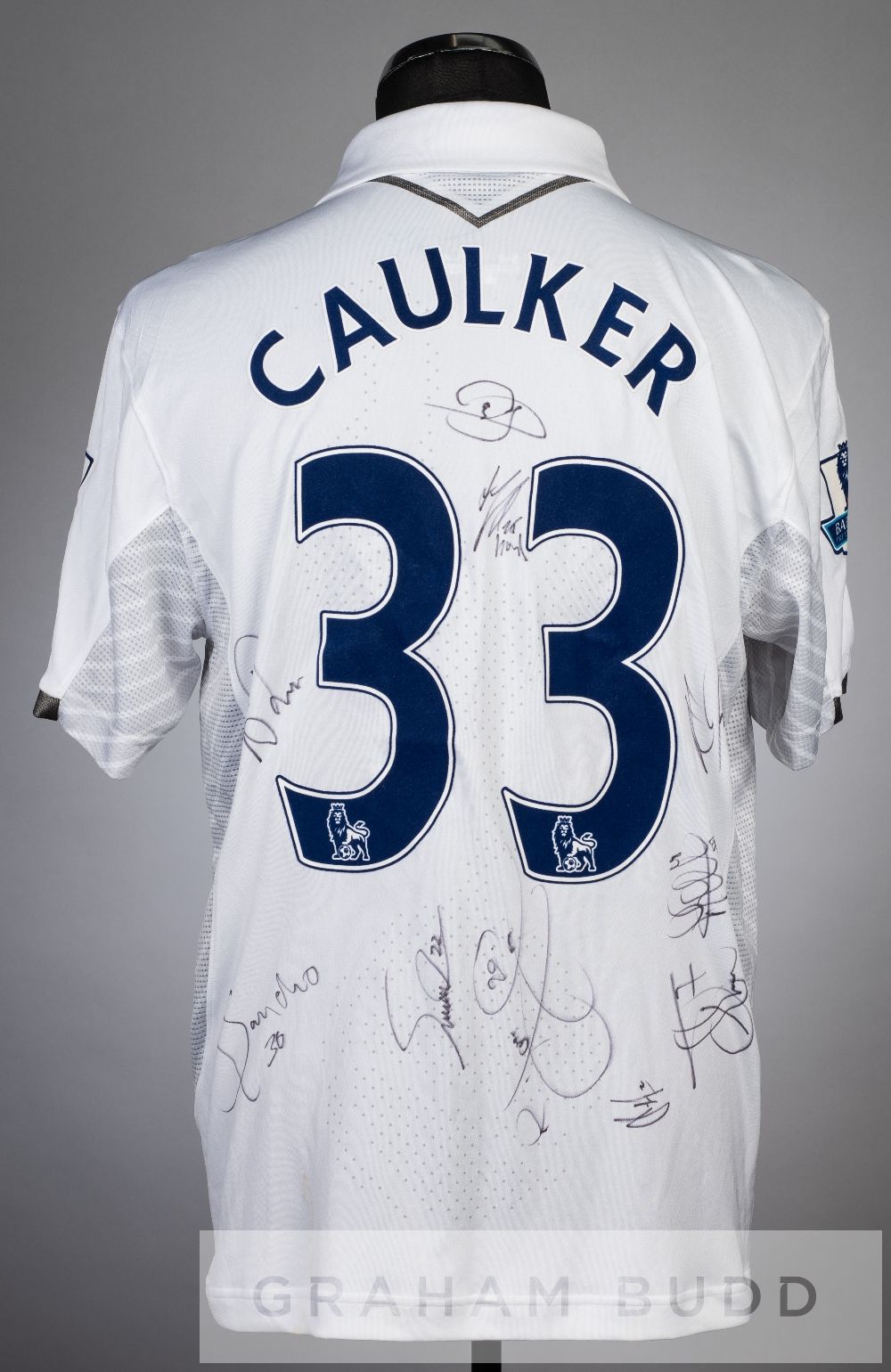 Steven Caulker team signed white Tottenham Hotspur no.33 home jersey, season 2012-13, short-sleeved BARCLAYS PREMIER LEAGUE sleeve badges, club crest and sponsor logo, signed on the reverse in black marker pen by approximately 10 players including Rose, Naughton, Sandro, Dawson, Lloris, Dempsey, Townsend, Defoe, Lennon and Sigurdsson