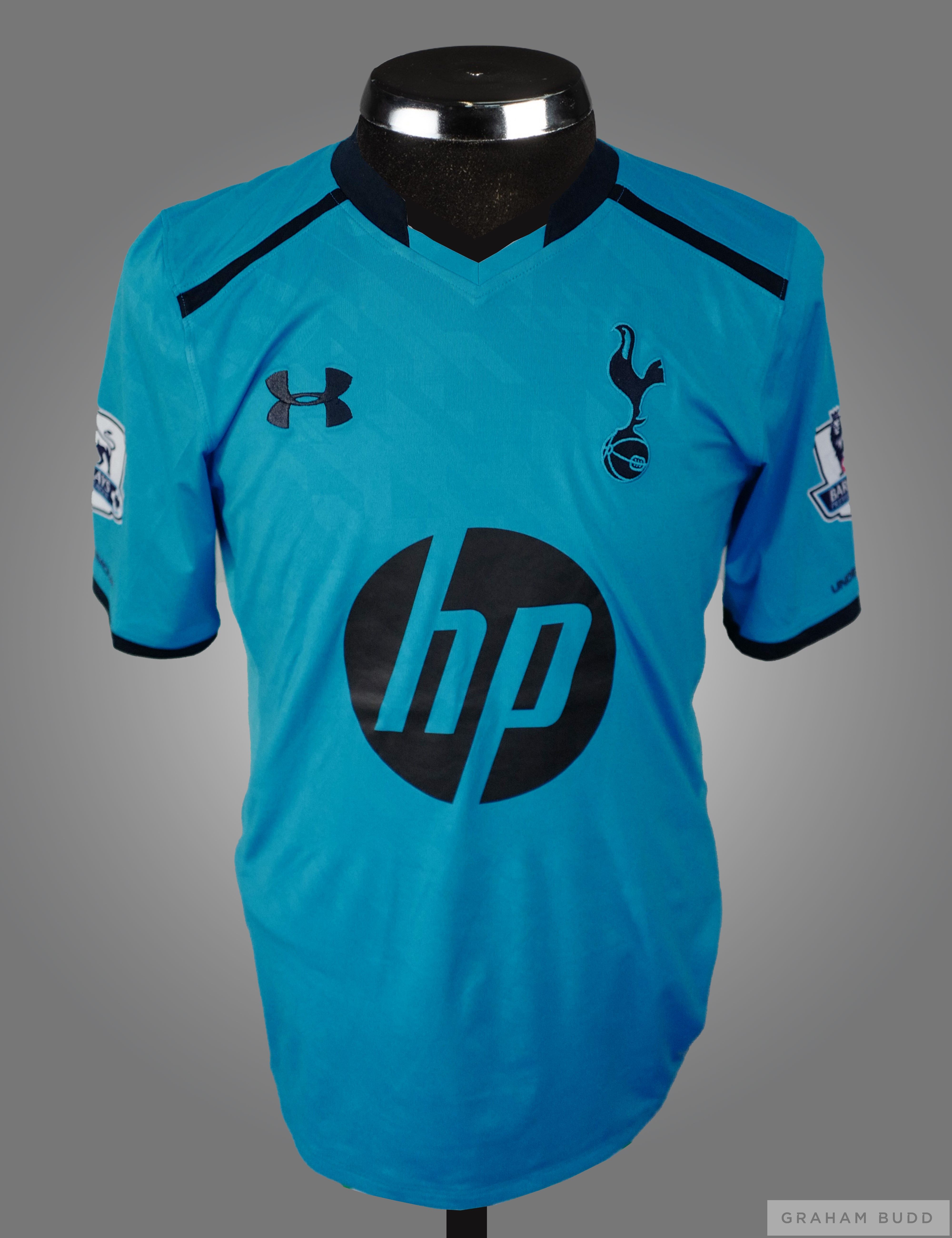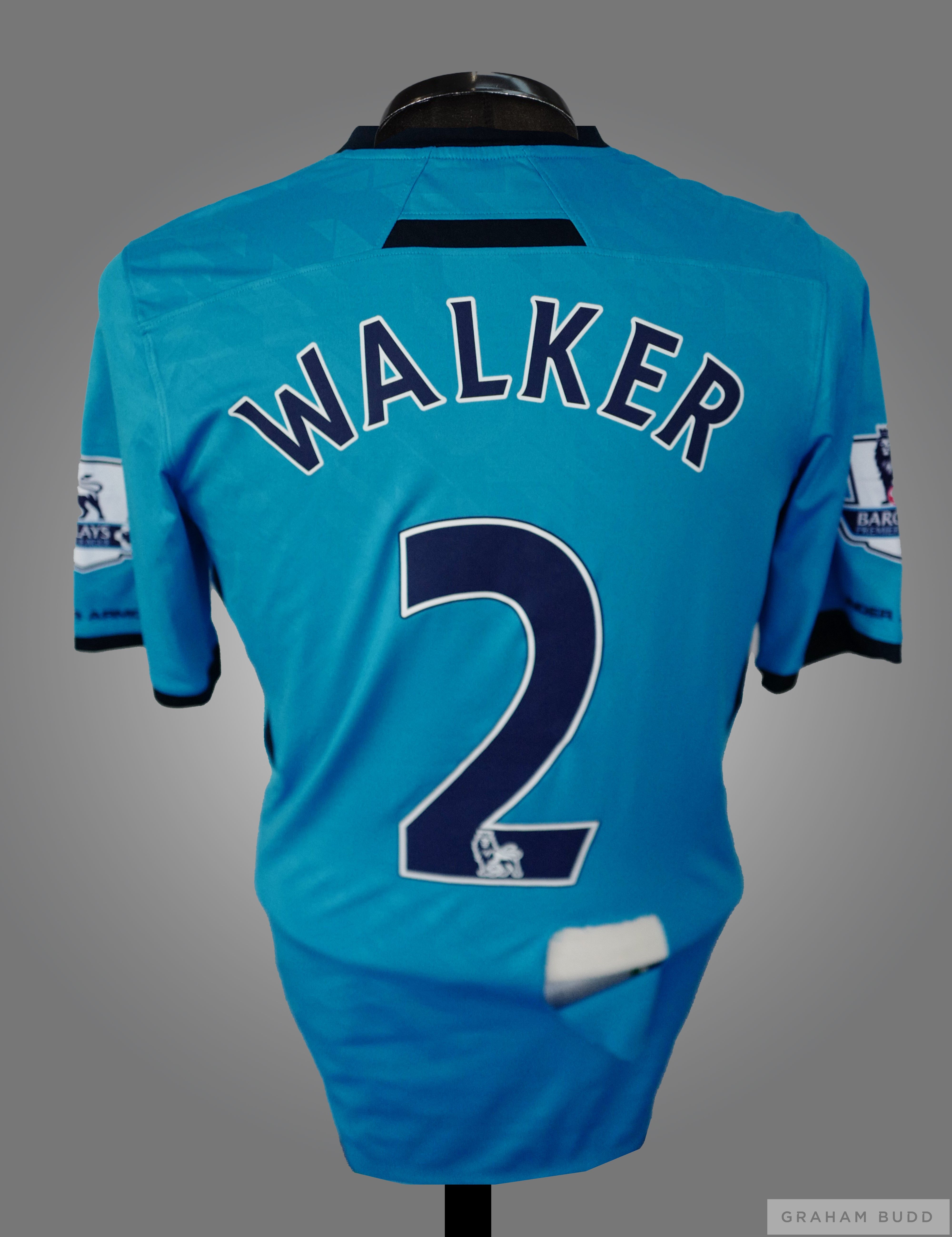Kyle Walker light blue Tottenham Hotspur No.2 away jersey season 2013-14, short-sleeved with BARCLAYS PREMIER LEAGUE sleeve badges, club crest and sponsor logo, reverse lettered WALKER, shirt features a rip to the reverse, sustained in action, and was subsequently ‘retired’
