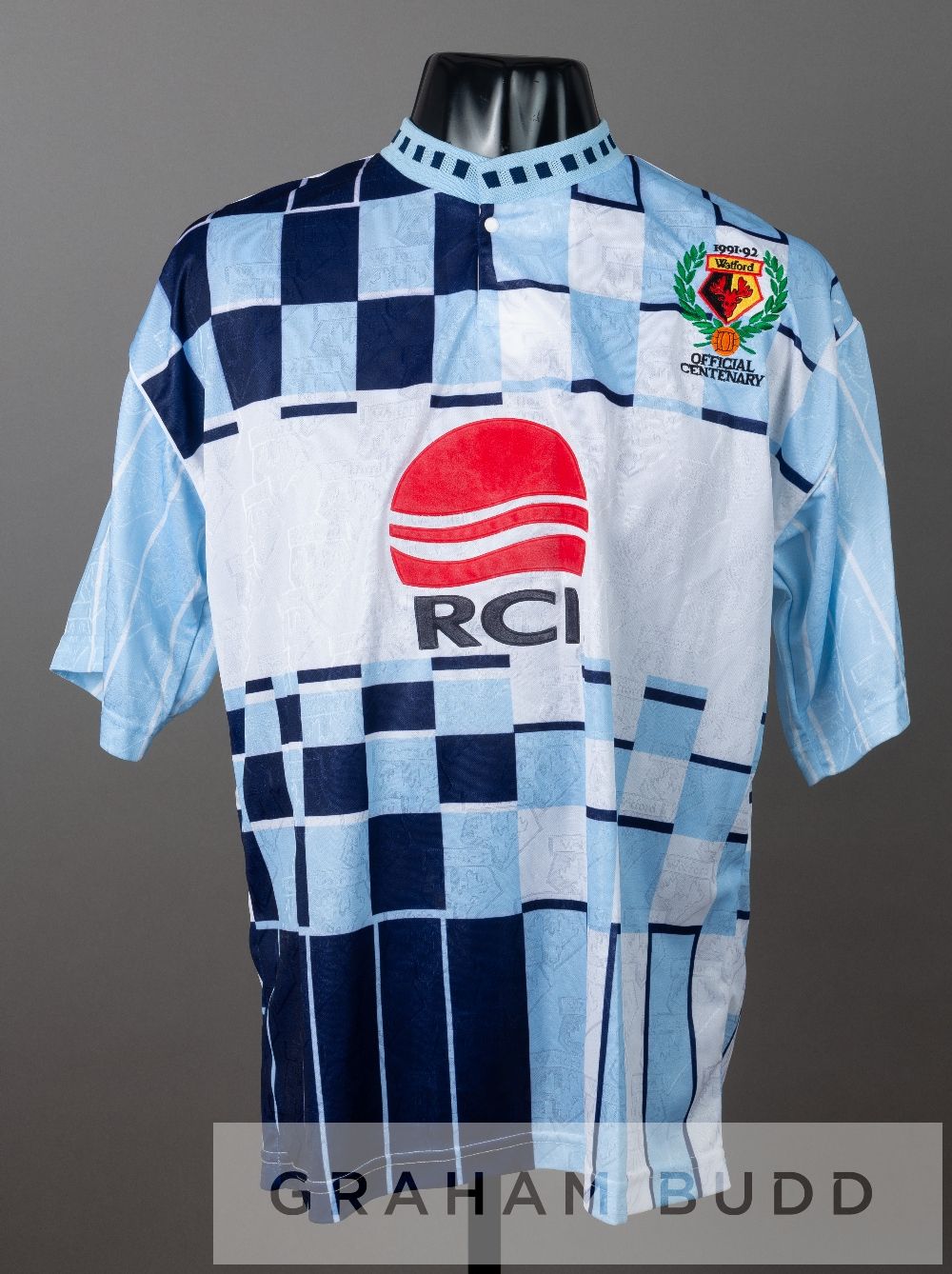 Blue and white Watford no.15 substitute's away jersey from the Club's 1991-92 Centenary season, by Bukta, short-sleeved with THE FOOTBALL LEAGUE sleeve badges, the embroidered club crest inscribed 1991-92 OFFICIAL CENTENARY and sponsor logo, reverse numbered 15