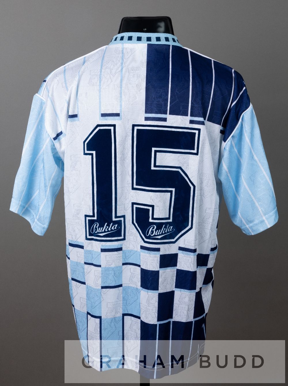 Blue and white Watford no.15 substitute's away jersey from the Club's 1991-92 Centenary season, by Bukta, short-sleeved with THE FOOTBALL LEAGUE slee