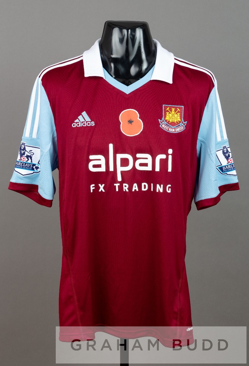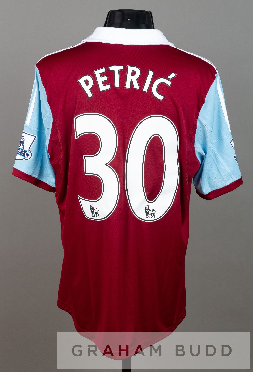 Mladen Petric claret and blue West Ham United no.30 Poppy home jersey v Aston Villa at Upton Park, 2nd November 2013, short-sleeved with BARCLAYS PREMIER LEAGUE sleeve badges, club crest, applied poppy badge and sponsor logo, reverse lettered PETRIC This fixture resulted in a 0-0 draw, Mladen Petric did not play in this fixture.