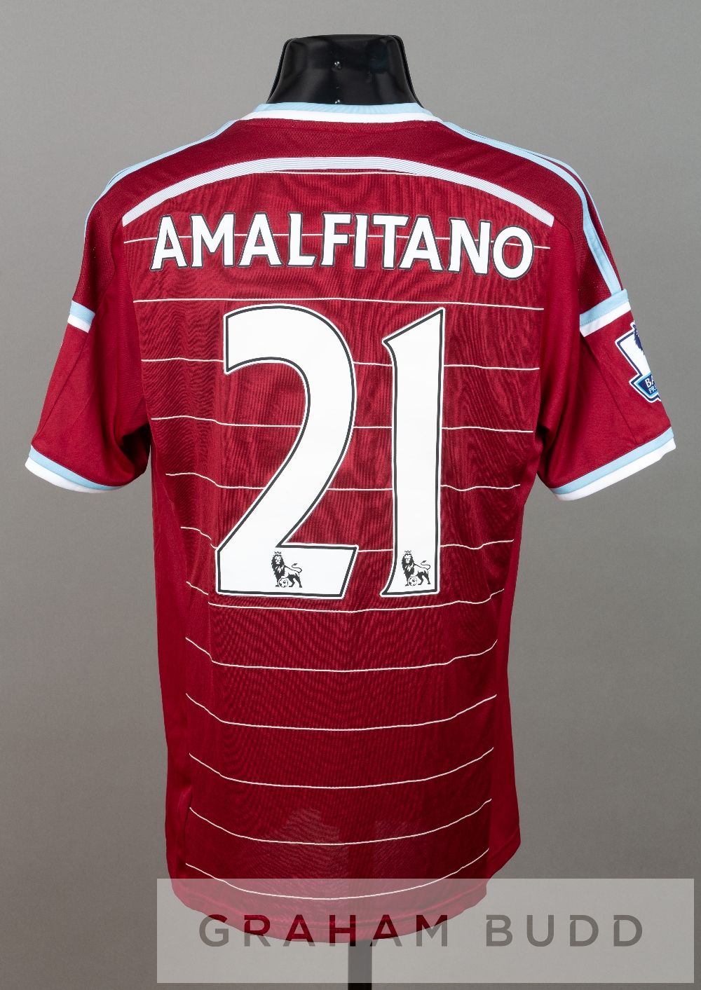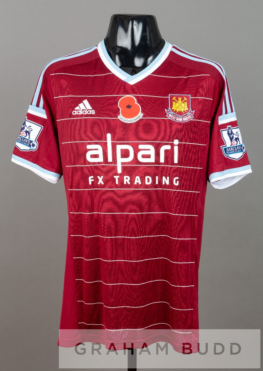 Morgan Amalfitano claret and blue West Ham United no.21 Poppy home jersey v Aston Villa at Upton Park, 8th November 2014, short-sleeved with BARCLAYS PREMIER LEAGUE sleeve badges, club crest, applied 1914-2014 FOOTBALL REMEMBERS poppy badge and sponsor logo, reverse lettered AMALFITANO This fixture resulted in a 0-0 draw, with Morgan Amalfitano on the bench for this fixture.