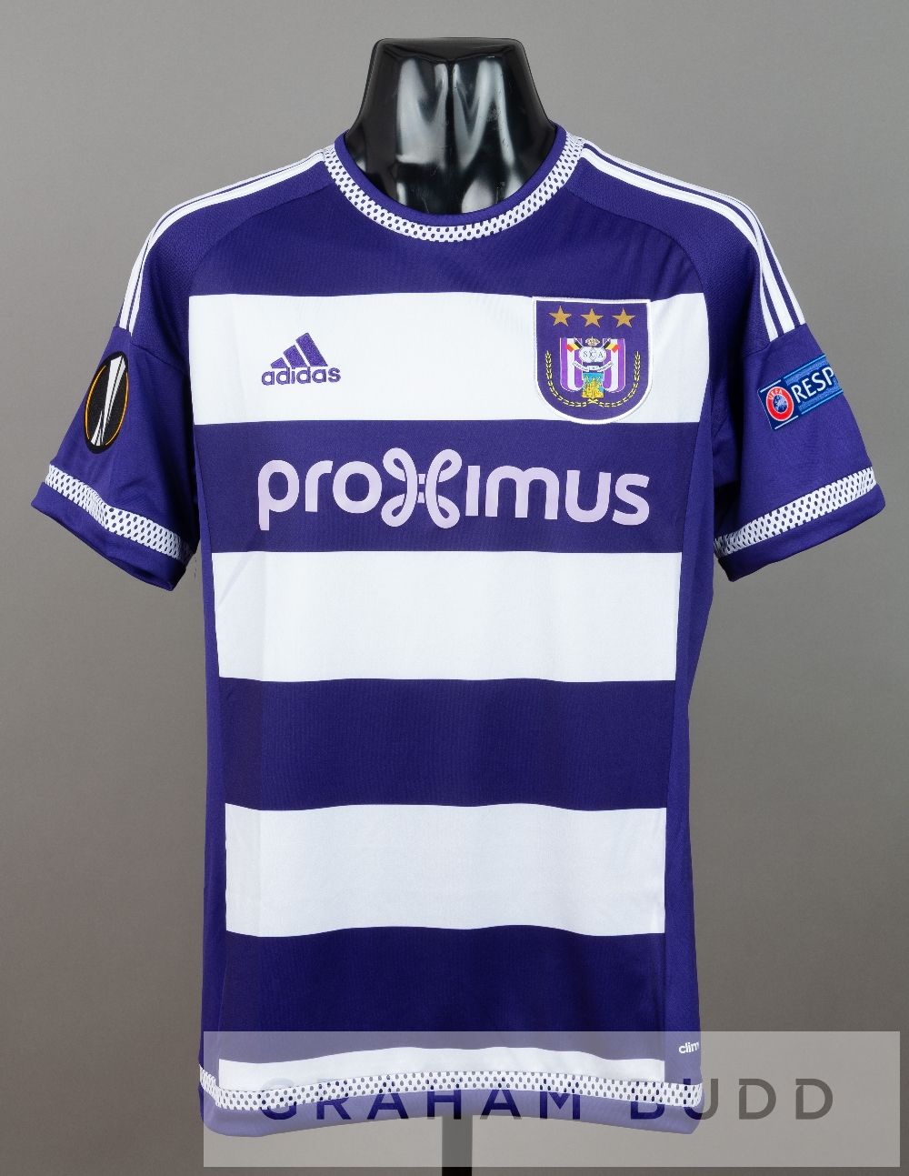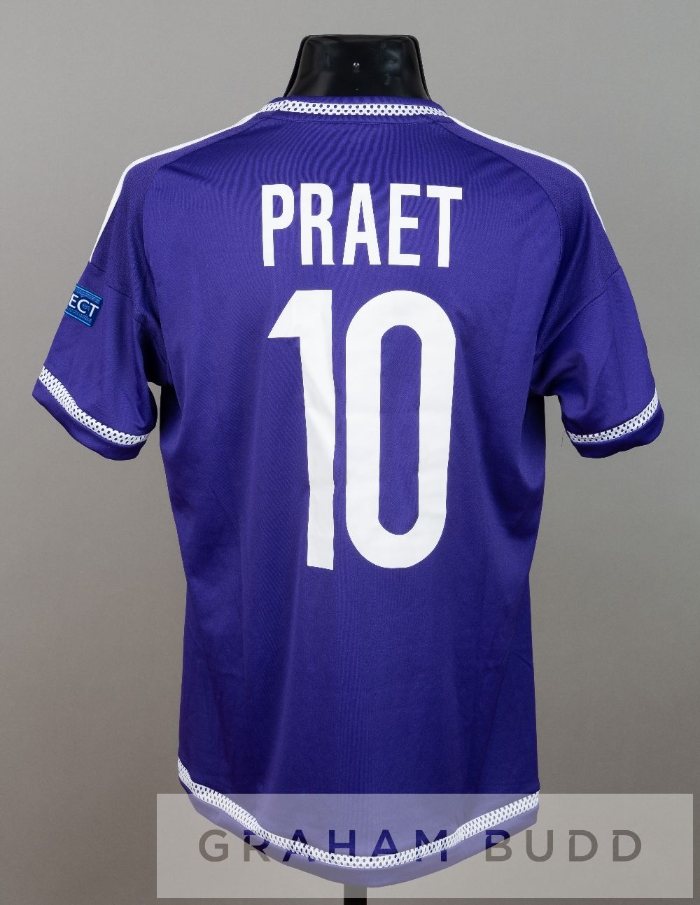 David Praet purple and white Anderlecht no.10 jersey v Tottenham Hotspur in UEFA Europa League group J, at Constant Vanden Stock, 22nd October 2015, short-sleeved with UEFA EUROPA LEAGUE and RESPECT sleeve badges, club crest and sponsor logo, reverse lettered PRAET Anderlecht defeated Tottenham Hotspur 2-1, with David Praet receiving a yellow card in the 58th minute.