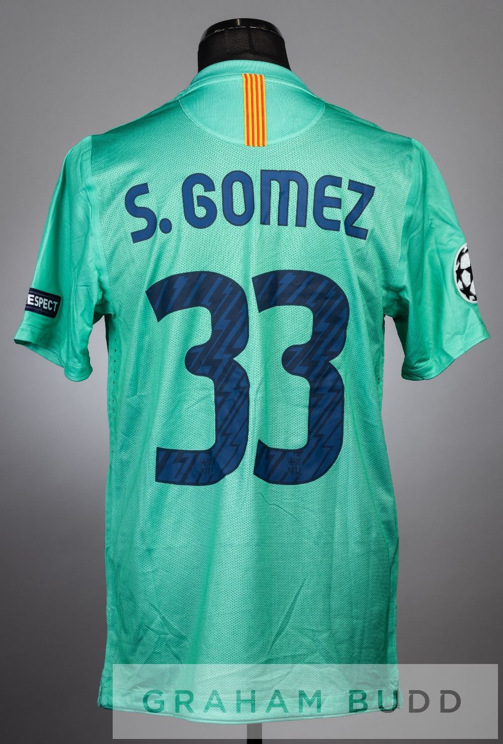 Sergi Gomez cool mint Barcelona no.33 away jersey v Arsenal in the UEFA Champions League Round of 16 first leg , at Emirates Stadium, 16th February 2011, short-sleeved with UEFA STARBALL and RESPECT sleeve badges, club crest and sponsor logo, reverse lettered S. GOMEX Arsenal defeated Barcelona 2-1, Sergi Gomez did not play in this fixture.