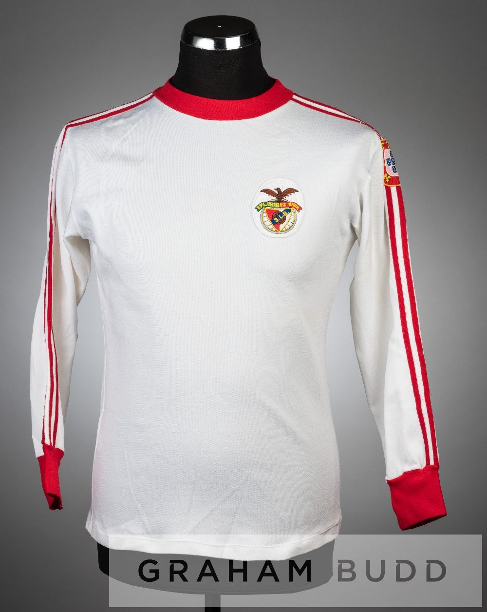 White and red SL Benfica no.10 away jersey, circa late 1970s, long-sleeved with Portuguese coat of arms sleeve badge and club crest badge, reverse numbered 10 This jersey came from the late Manchester United kit manager and have been on loan to the Manchester United Museum until recently.