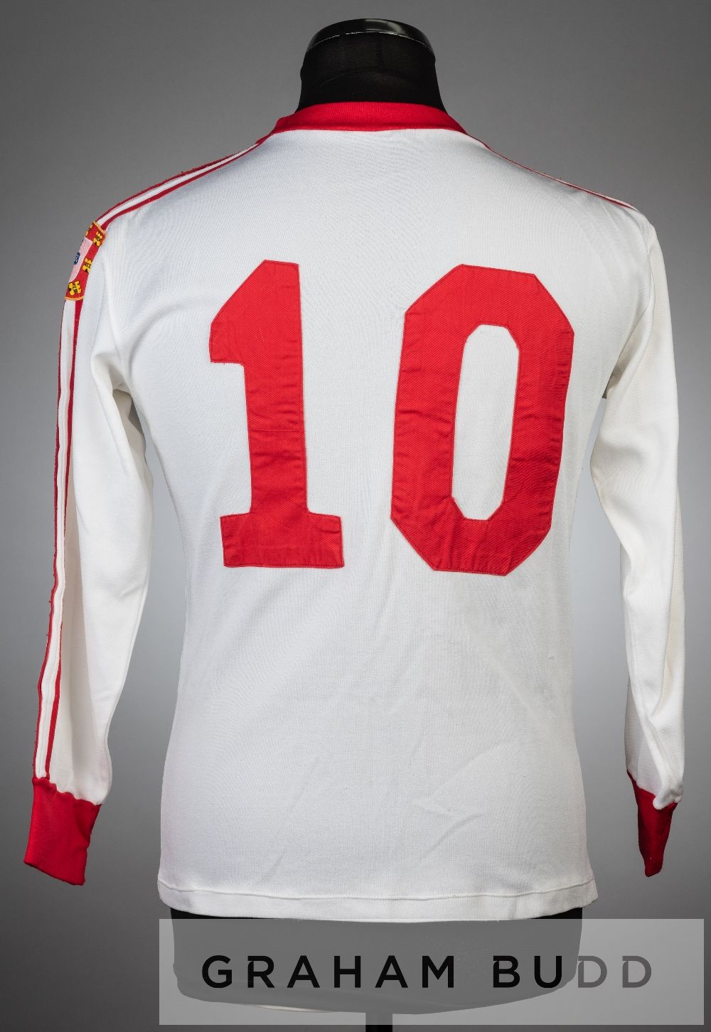 White and red SL Benfica no.10 away jersey, circa late 1970s, long-sleeved with Portuguese coat of arms sleeve badge and club crest badge, reverse nu