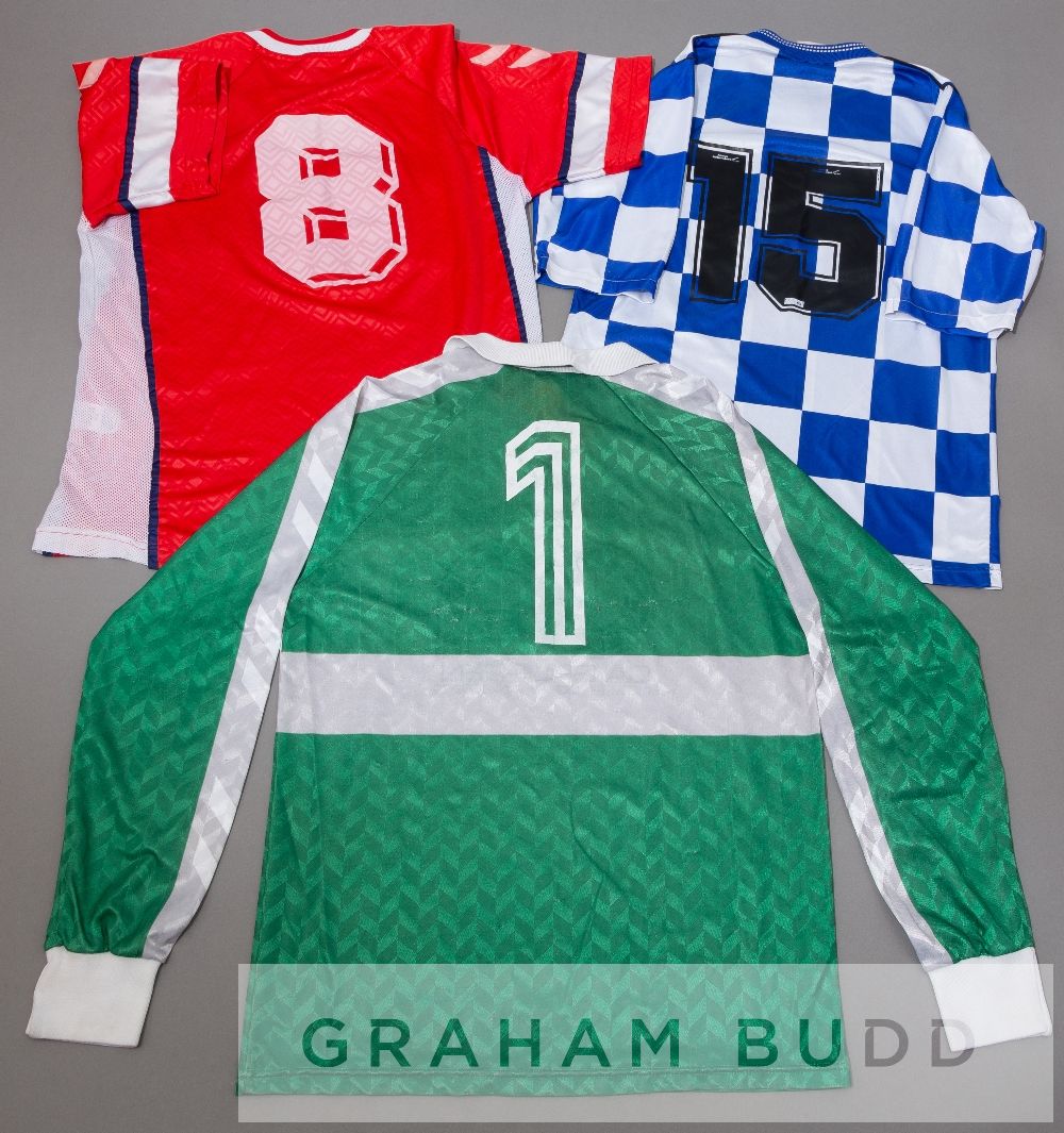 Two Boldklubben 1909 jerseys, circa early 1990s, both by Hummel, the first a short-sleeved no.8 WINTERTHUR jersey and a green goalkeeper's no.1 long-sleeved CA-GRUPPEN jersey, sold with a Blue and white striped Miðvágs Bóltfelag no.15 jersey, by Umbro, short-sleeved with club crest and sponsor logo, reverse numbered 15, (3) There is a hand written note attached to the green goalkeeper's no.1 jersey neck label indicating the player to be Jens Kristian-Haraldsen, who was a international goalkeeper for the Faroe Island's.
