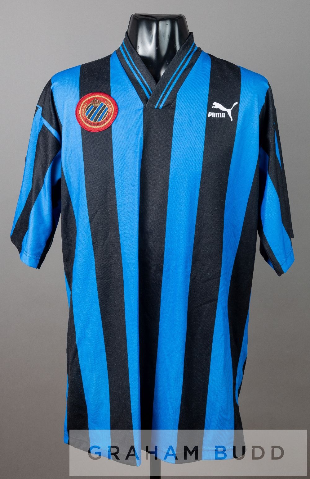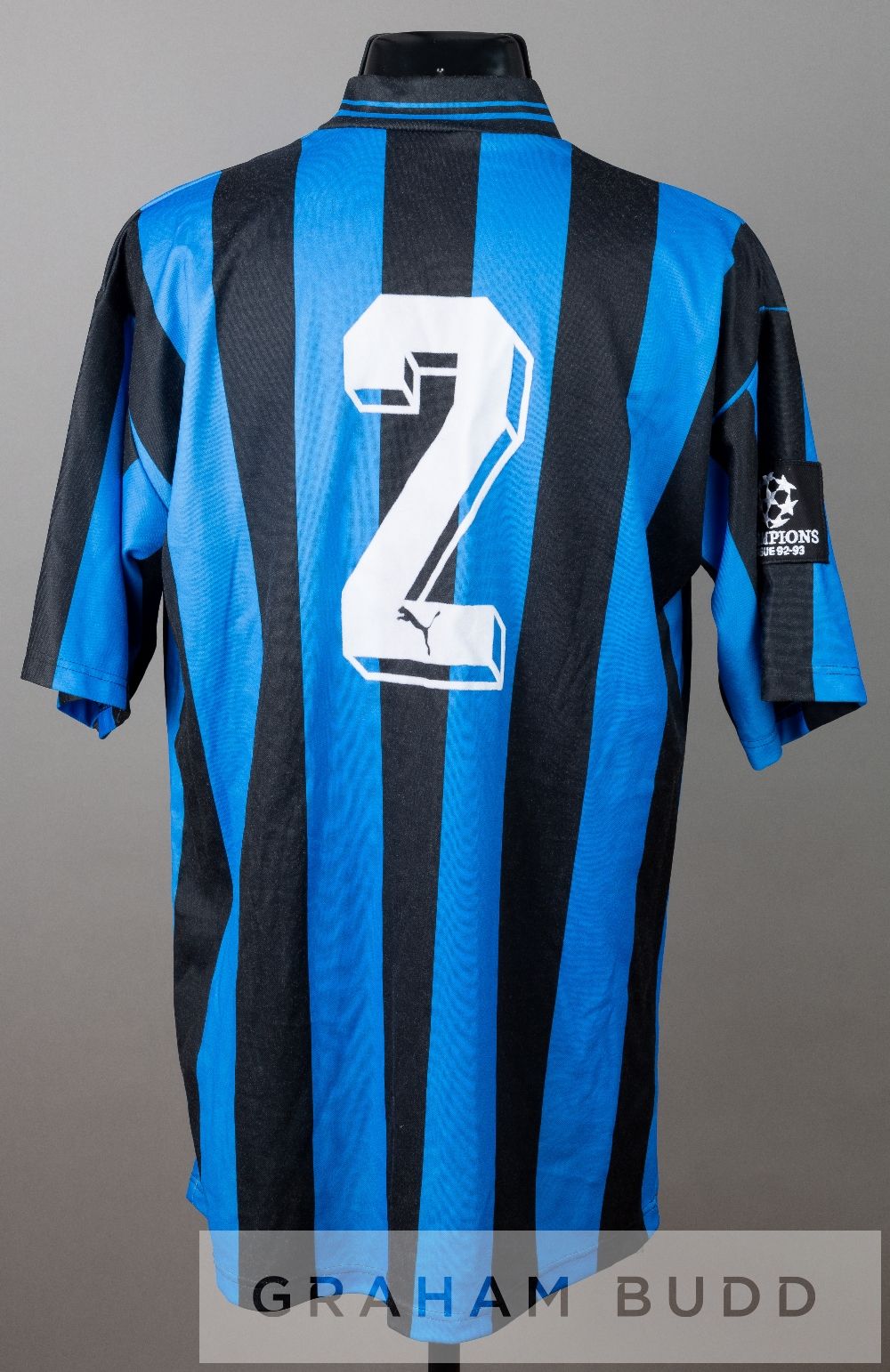 Blue and black stripped Club Brugge K.V. UEFA Champions League no.2 jersey, season 1992-93, by Puma, short-sleeved with UEFA CHAMPIONS LEAGUE 92-93 sleeve badge, club crest and sponsor logo, reverse numbered 2 The regular number two for Club Brugge K.V. was Laszlo Disztl.