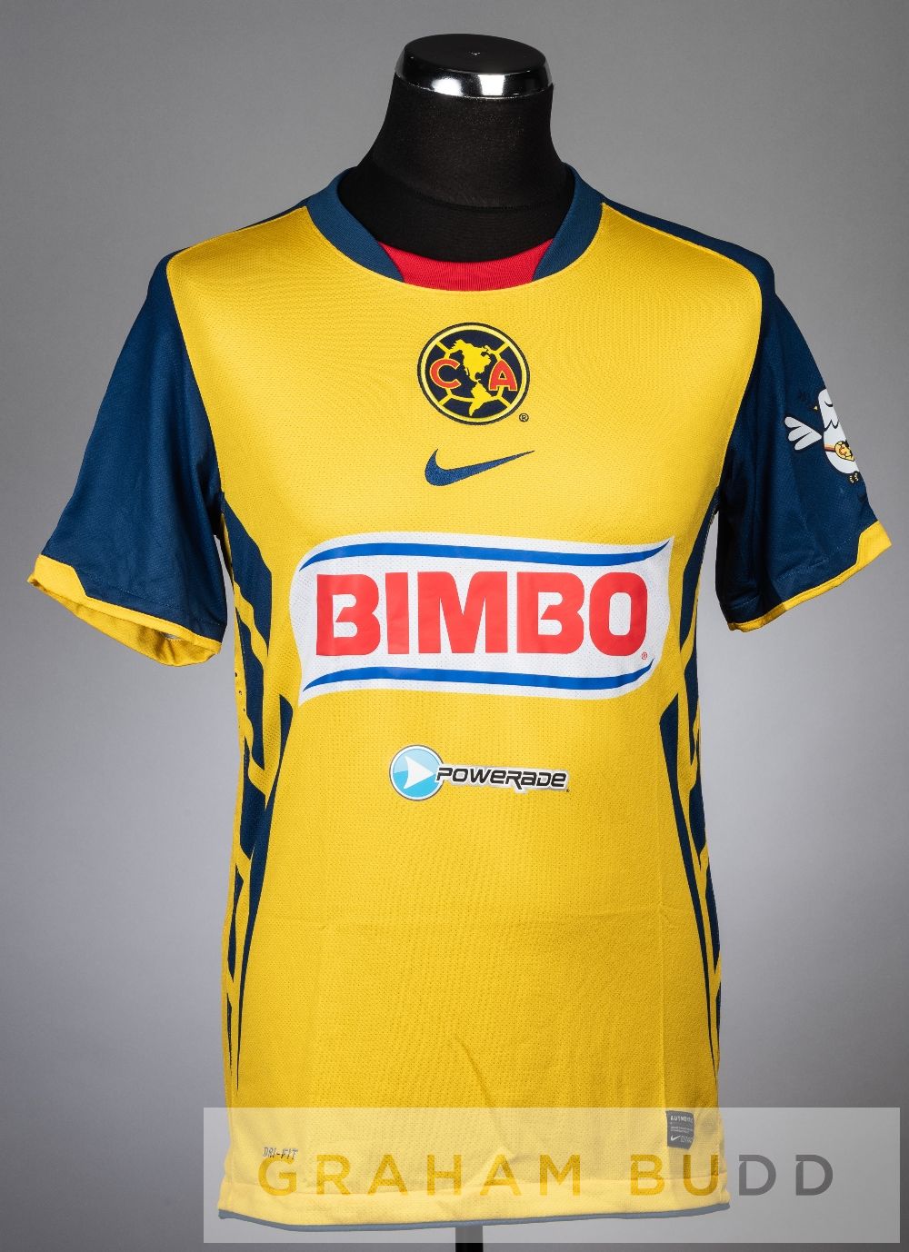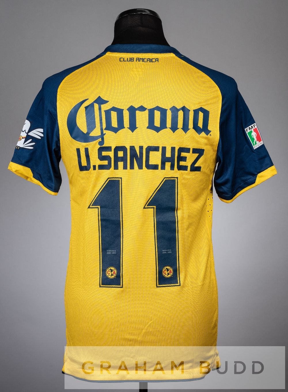 Jorge Sanchez yellow and navy Club America no.11 jersey v Manchester City in the Atlanta International Soccer Challenge at Georgia Dome, 29th July 2010, short-sleeved with FMF OFICIAL and sponsor logo sleeve badges, club crest and sponsor logo, reverse lettered V. SANCHEZ This fixture resulted in a 1-1 draw going onto a penalty shoot-out resulting in Manchester City defeated Club America 4-1.