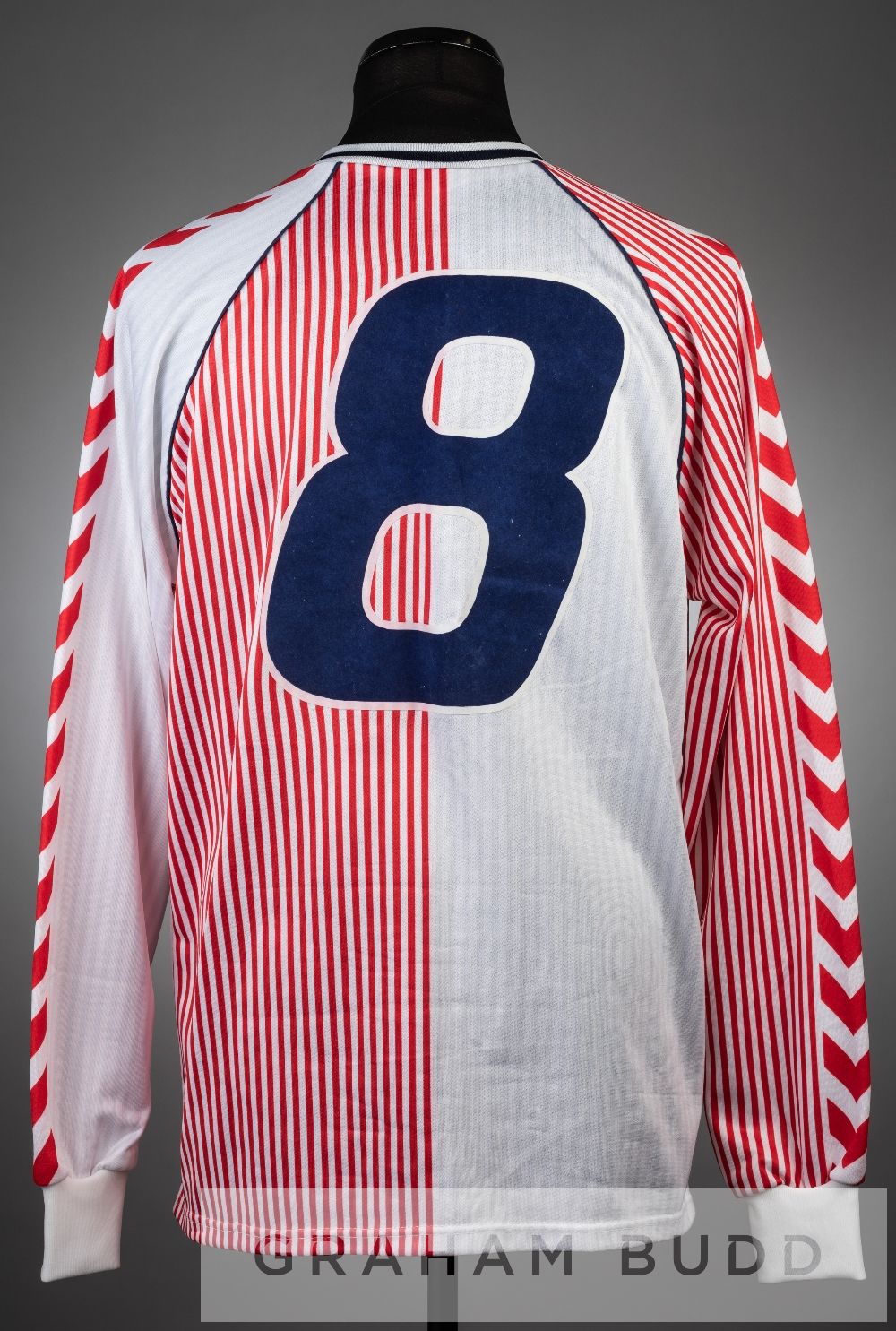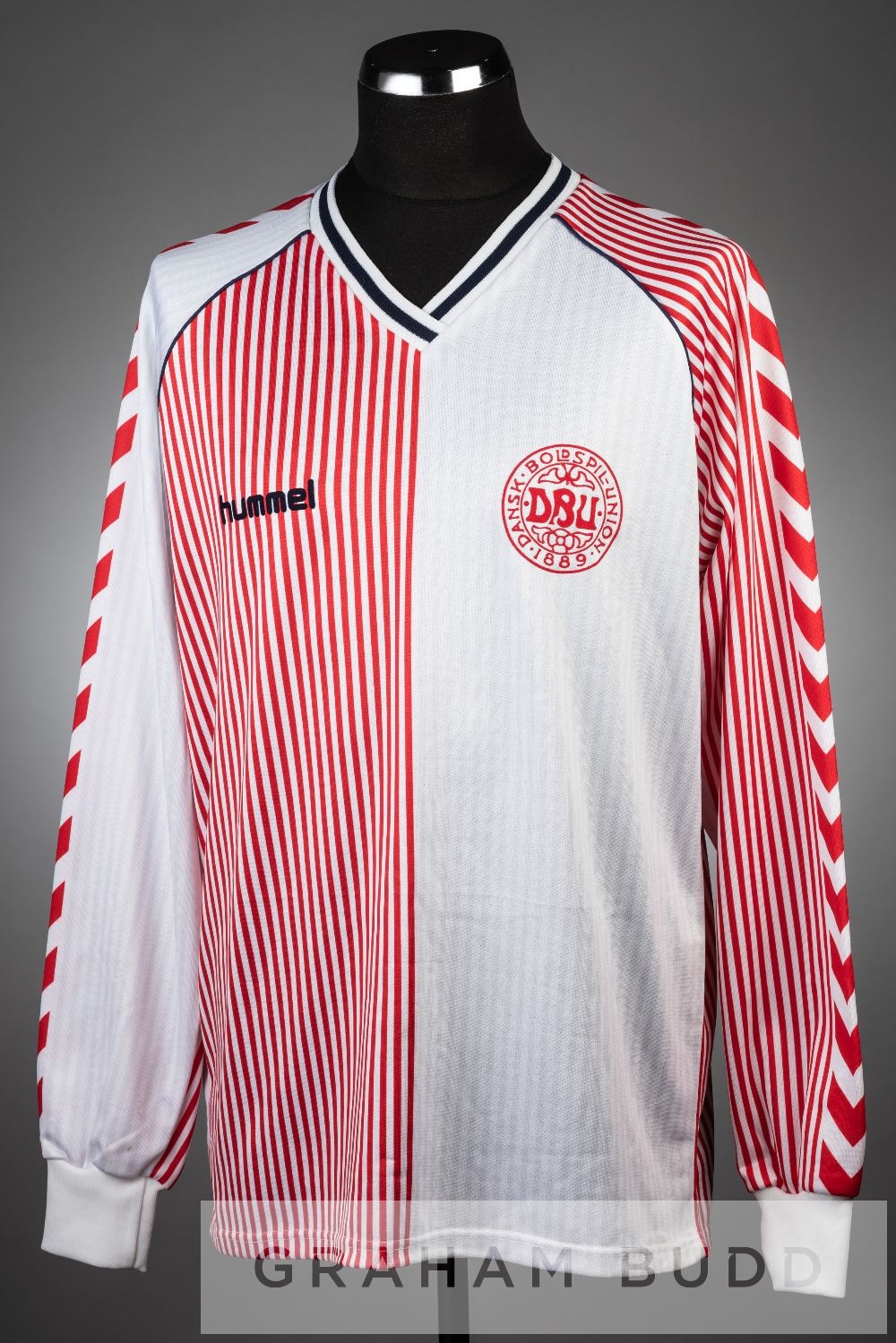 Jesper Olsen white, red and navy Denmark no.8 away jersey, season 1986-87, long-sleeved with country emblem and reverse numbered 8 This jersey came
