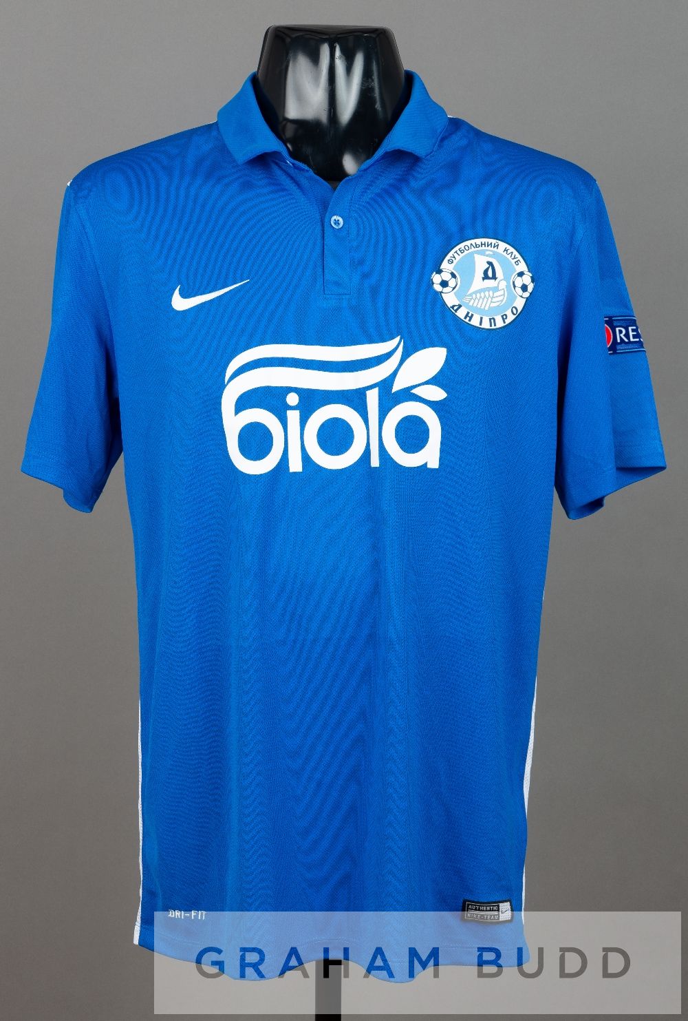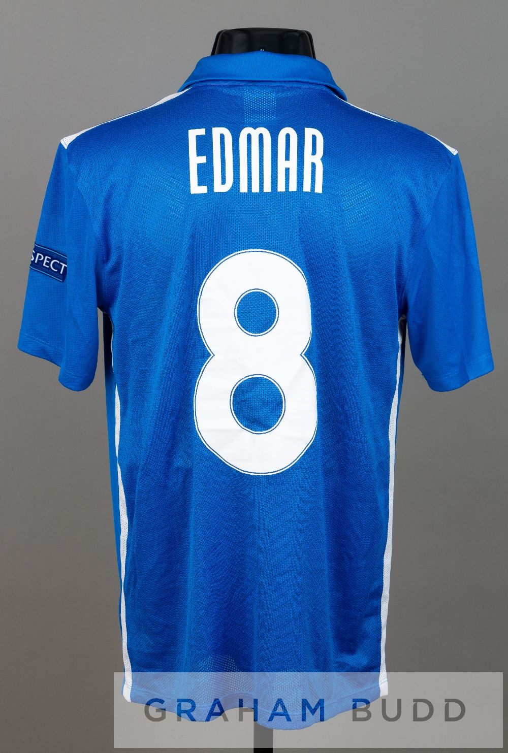 Edmar Halovskyi de Lacerda blue and white FC Dnipro no.8 home jersey, UEFA Europa League season 2015-16, short-sleeved with UEFA EUROPA LEAGUE and RESPECT sleeve badges, club crest and sponsor logo, reverse lettered EDMAR Edmar Halovskyi de Lacerda played for FC Dnipro from 2015 to 2016, making ten appearances, scoring one goal.