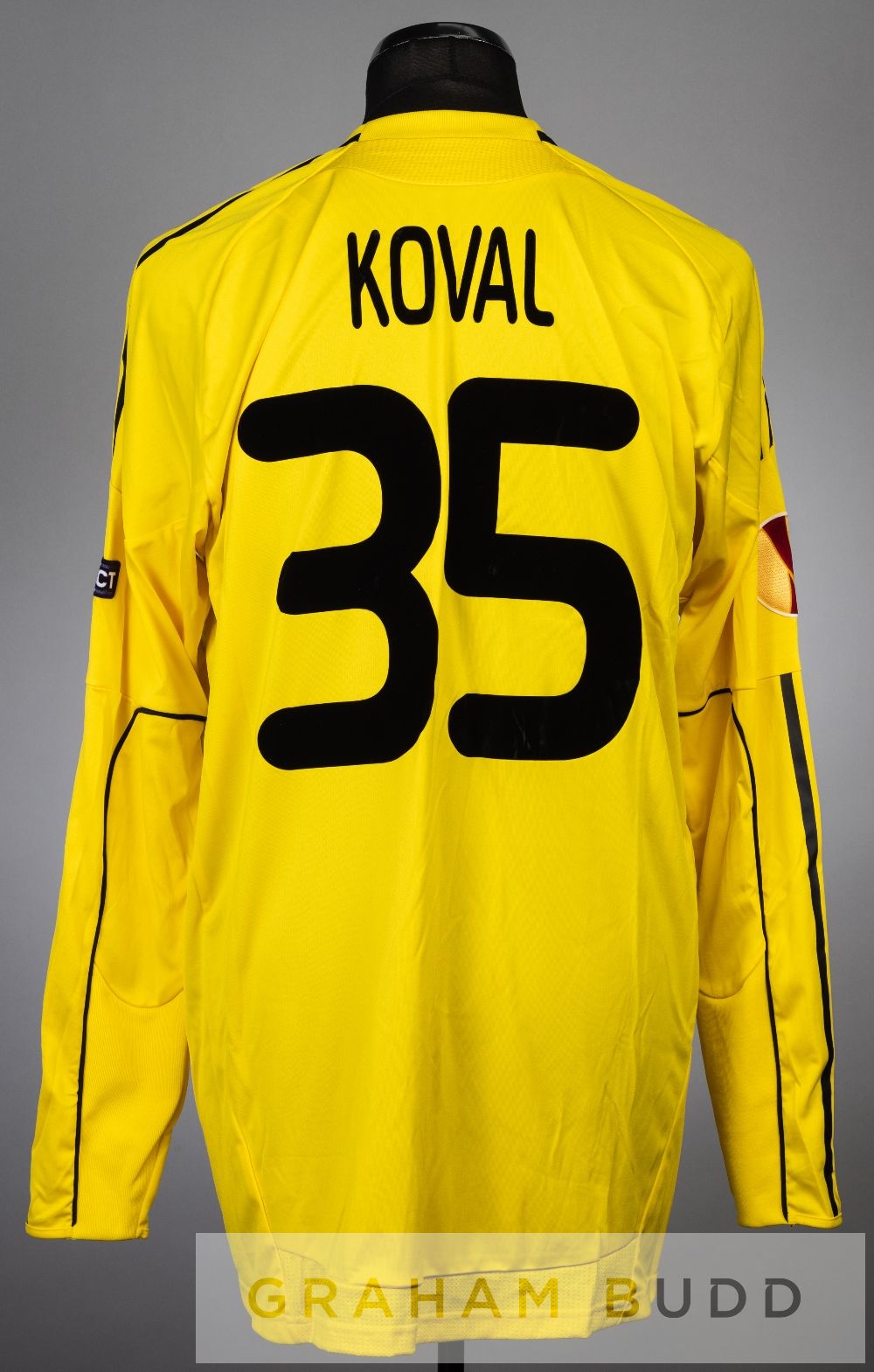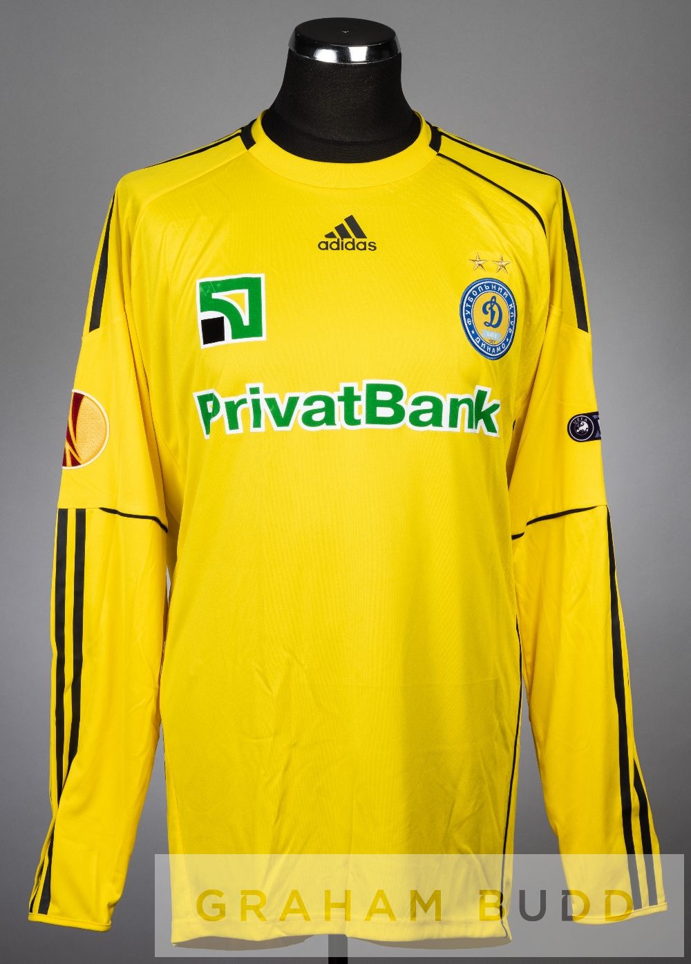 Koval yellow and black Dynamo Kiev no.35 goalkeeper's jersey v Manchester City in the UEFA Europa League round of 16 first leg at Valery Lobanovskiy Stadium, 10th March 2011, long-sleeved with UEFA EUROPA LEAGUE and RESPECT sleeve badges, club crest and sponsor logo, reverse lettered KOVAL Dynamo Kiev defeated Manchester City 2-0, with Maksym Koval on the substitutes bench.
