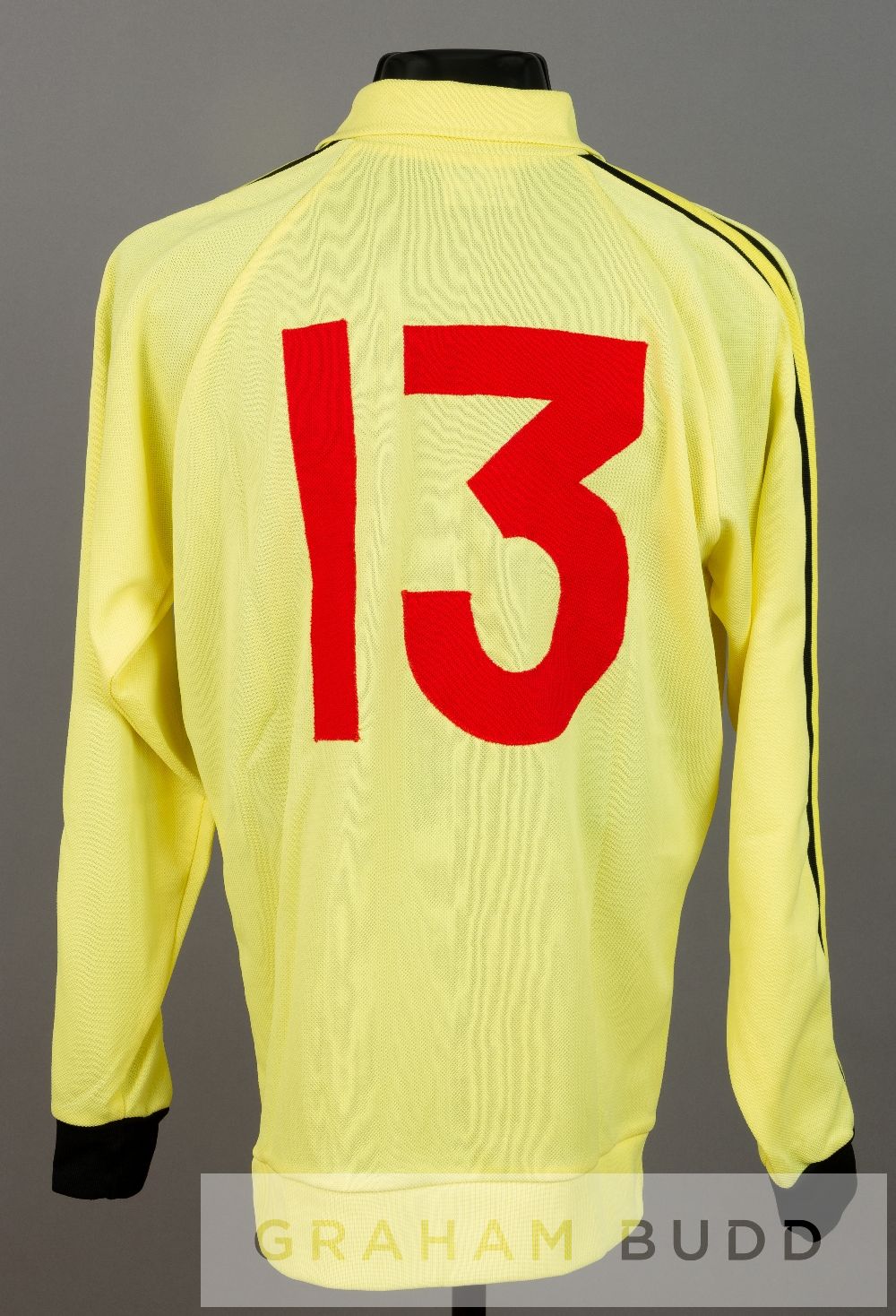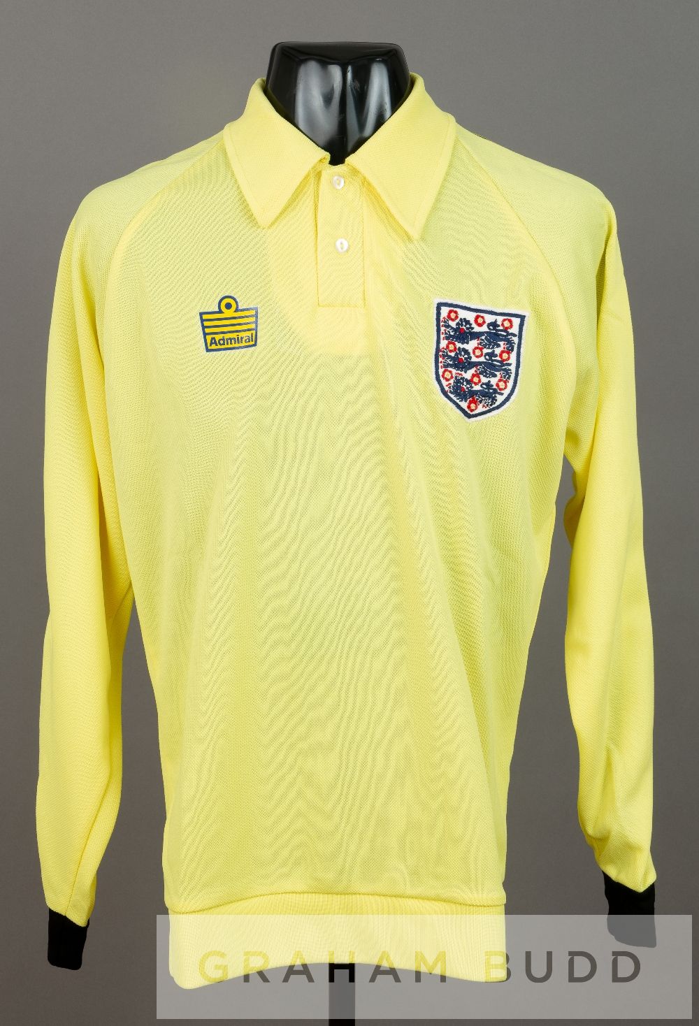 Peter Shilton yellow and black England no.13 goalkeeper's jersey, circa mid 1970s, by Admiral, long-sleeved with England three lion badge and sponsor logo, reverse numbered 13