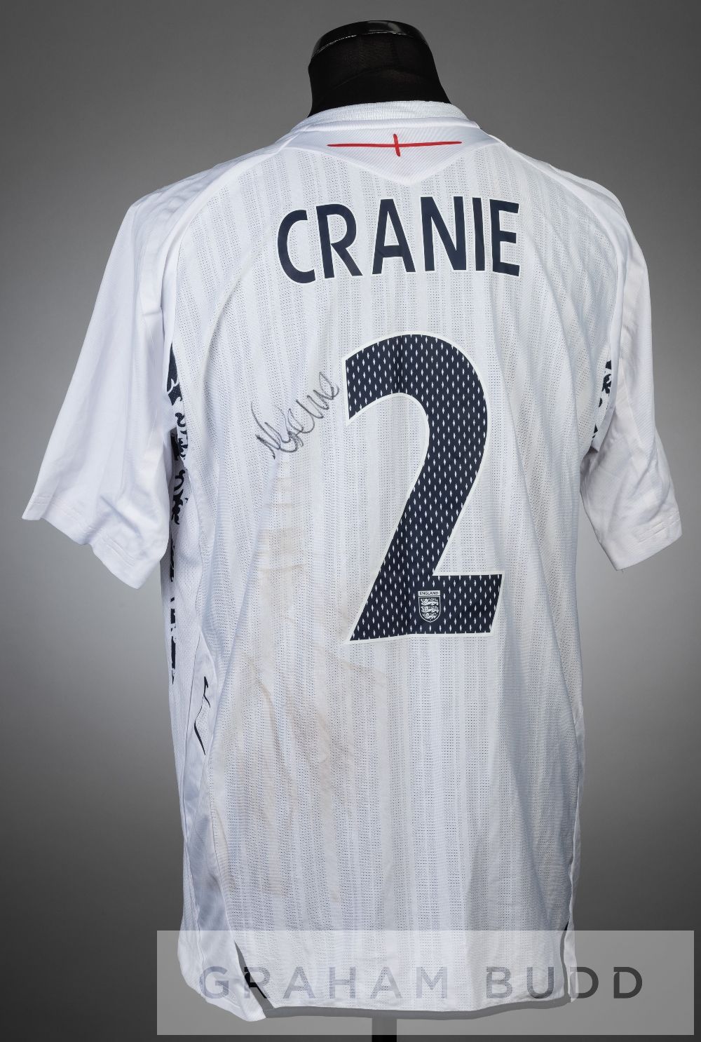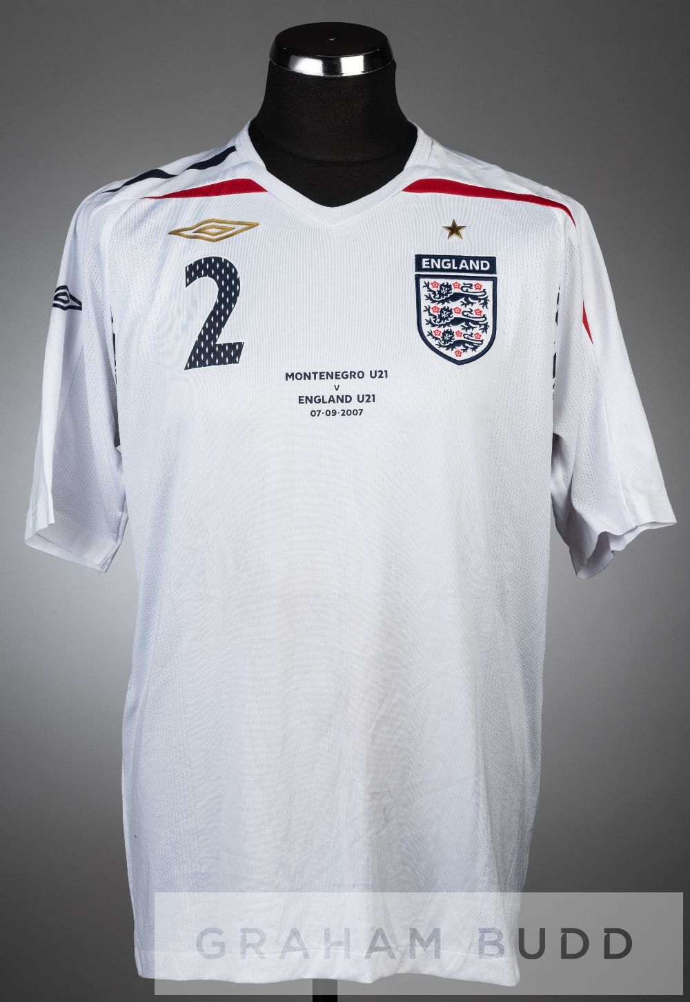 Martin Cranie signed white England U-21 no.2 jersey v Montenegro U-21 in the UEFA European U-21 Championship Qualifier in Podgorica, 7th September 2007, short-sleeved printed with MONTENEGRO U21 v ENGLAND U21 07.09.2007 with England three lion emblem, reverse lettered CRANIE, signed in black marker pen on reverse, bears pitch marks to reverse England U-21 defeated Montenefro U-21 3-0, with Martin Cranie playing in defence. Re-catalogued under item 34 into March 2022 GB46