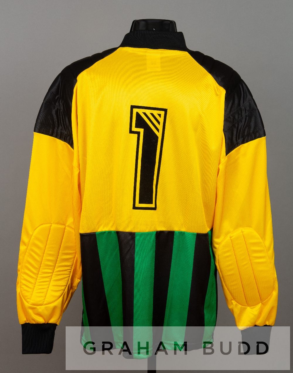 Packie Bonner yellow, green and black Republic of Ireland no.1 goalkeeper's jersey v Denmark in Copenhagen, 14th October 1992 the FIFA World Cup qualification match, by Adidas, spare long-sleeved with padded shoulders and elbows and country emblem, reverse numbered 1 Packie Bonner played for Republic of Ireland from 1981 to 1996, making 80 appearances. Provenance: formerly in the collection of a German Sports photographer from Hamburg, who was present at the fixture.