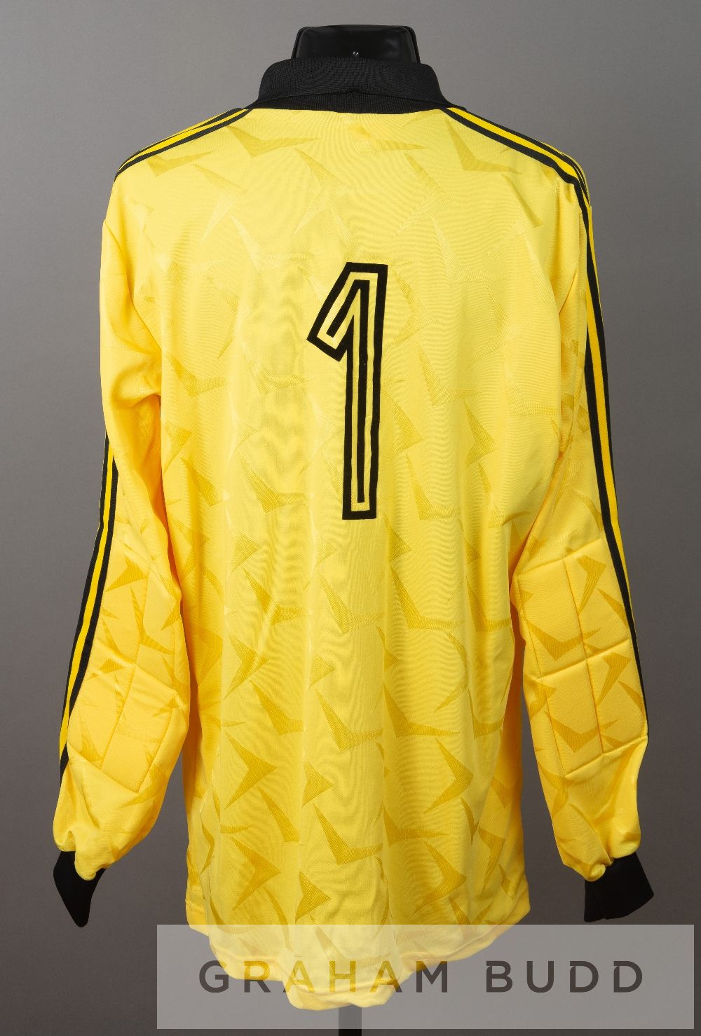 Gerry Peyton yellow Republic of Ireland No.1 goalkeeper's jersey from the Matt Busby testimonial match v Manchester United at Old Trafford, 11th August 1991, by Adidas, long-sleeved with elbow padding, FA IRELAND country badge and sponsor logo, reverse numbered 1 An rare jersey bearing the Opel sponsor name on the jersey as this was an unofficial match not under the control of FIFA or UEFA. This fixture resulted in a 1-1 draw.