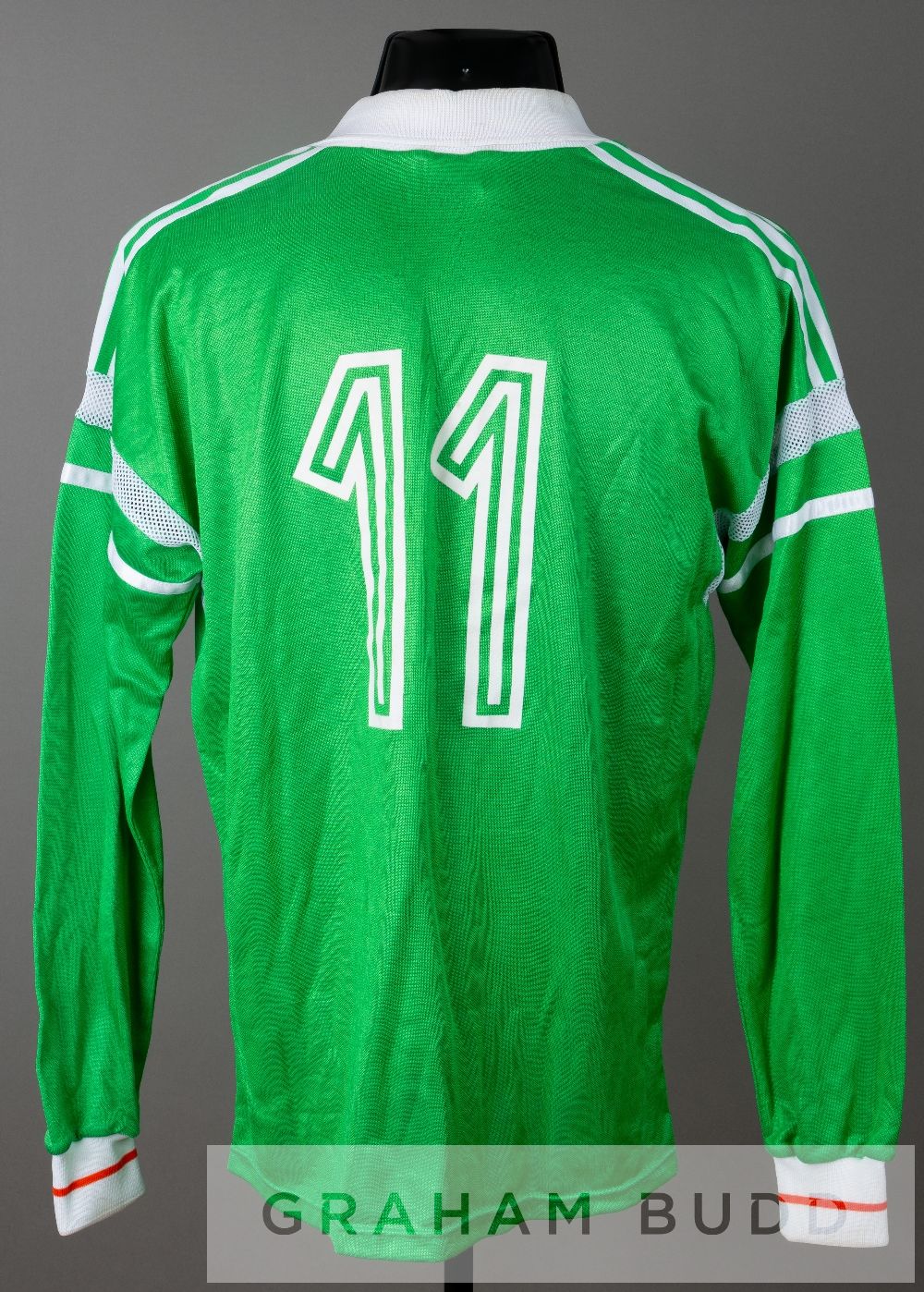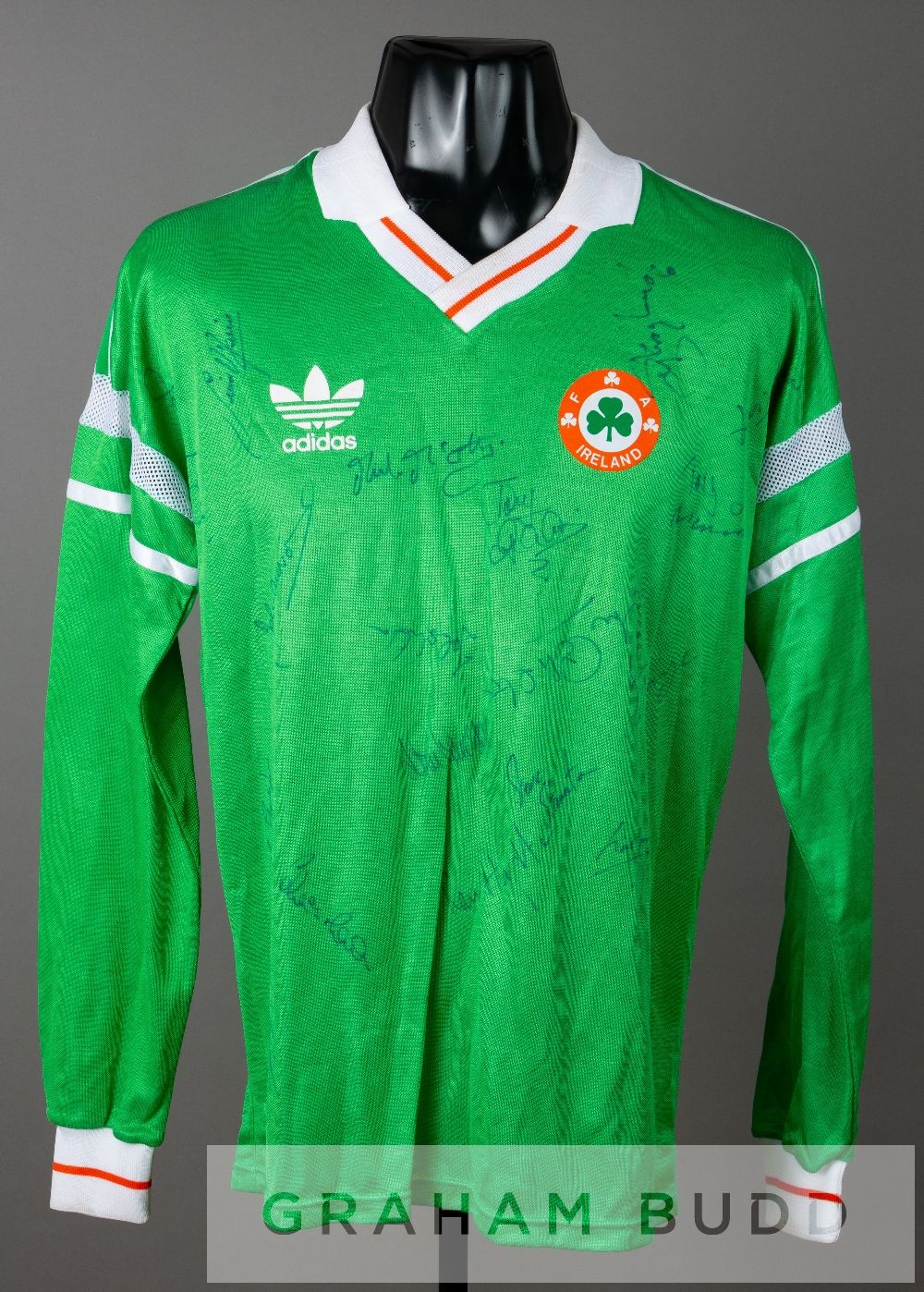Squad signed green Republic of Ireland no.11 home jersey, circa 1988, by Adidas, long-sleeved with FA IRELAND country badge and sponsor logo, reverse numbered 11, signed by approximately 18 squad members including Steve Staunton, Kevin Moran, Mick McCarthy, Ray Houghton, Niall Quinn, Gerry Peyton, Frank Stapleton and others in black marker pen
