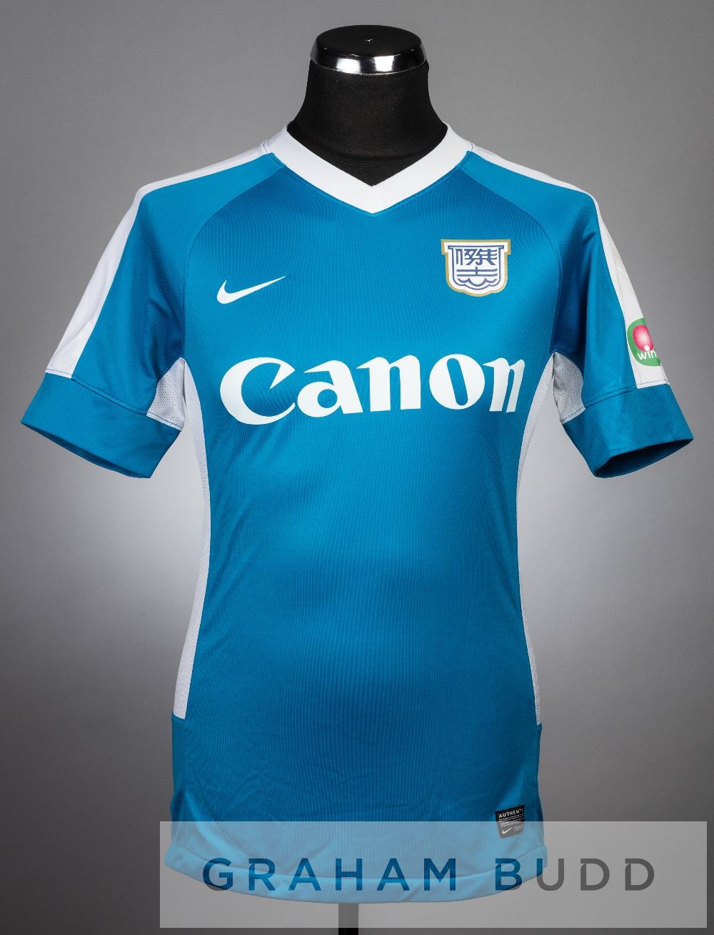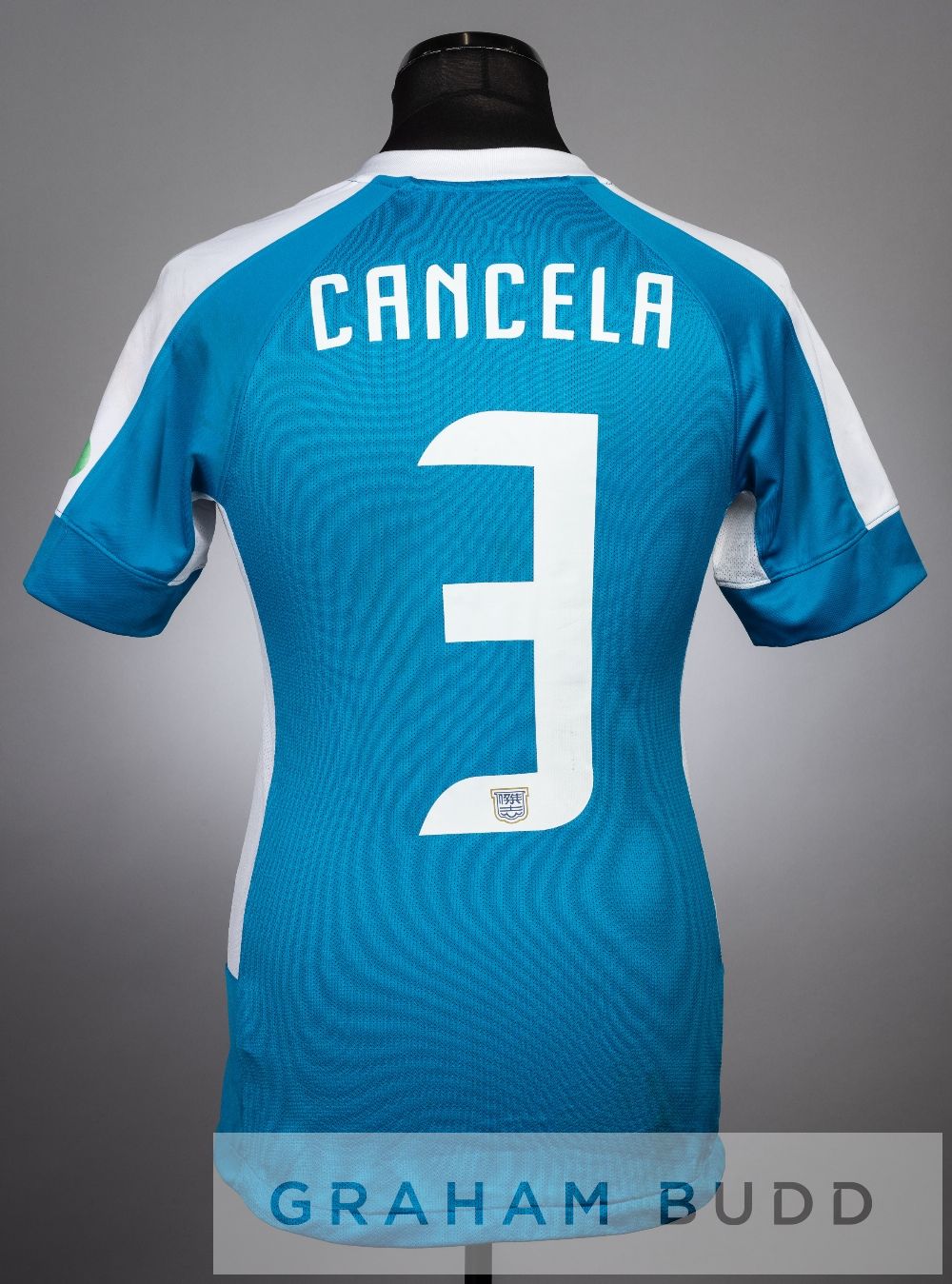 Dani Cancela blue and white Kitchee FC no.3 jersey v Arsenal, at Hong Kong Stadium, 29th July 2012, short-sleeved with WINPLE sleeve badge, club crest and sponsor logo, reverse lettered CANCELA This fixture resulted in a 2-2 draw, with Dani Cancela scoring Kitchee FC's second goal in the 28th minute.
