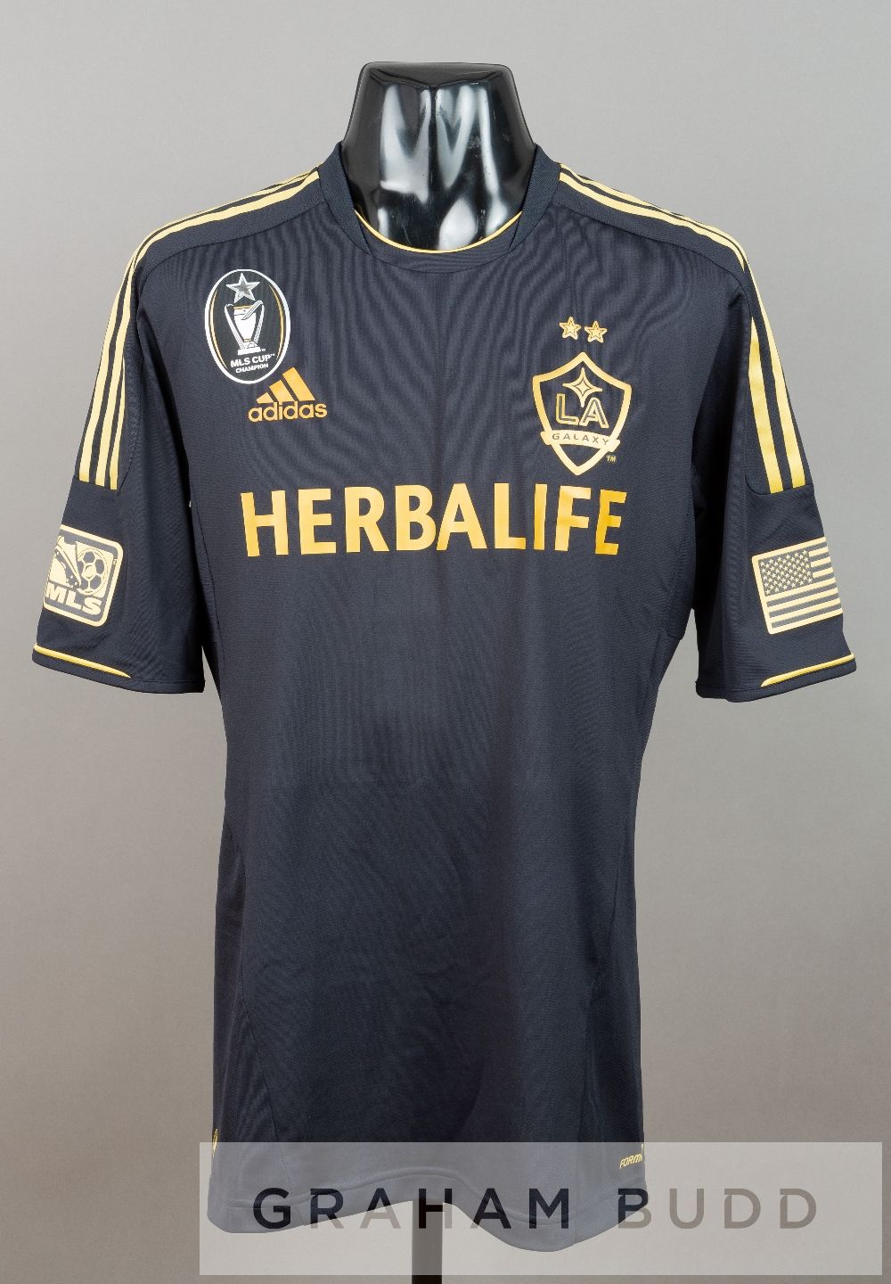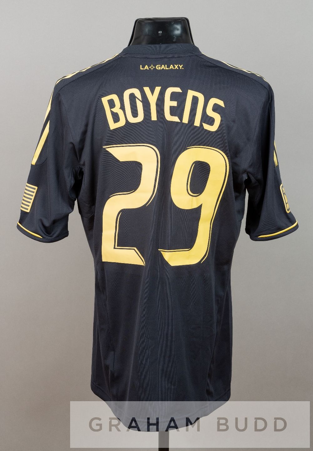 Andrew Boyens navy LA Galaxy no.29 third change jersey v Tottenham Hotspur in the pre-season USA tour, at Depot Center, 24th July 2012, short-sleeved with MLS and USA flag sleeve badges, MLS CUP CHAMPION badge, club crest and sponsor logo, reverse lettered BOYENS This fixture resulted in a 1-1 draw with a goal by Gareth Bale for Tottenham and a goal by David Junior Lopes. Andrew Boyens was substituted on in the 64th minute replacing Gonzalez.