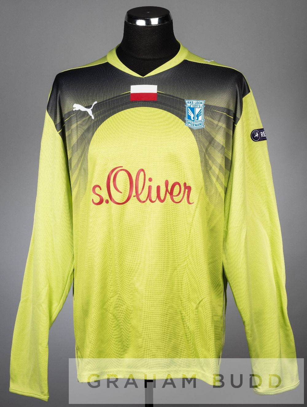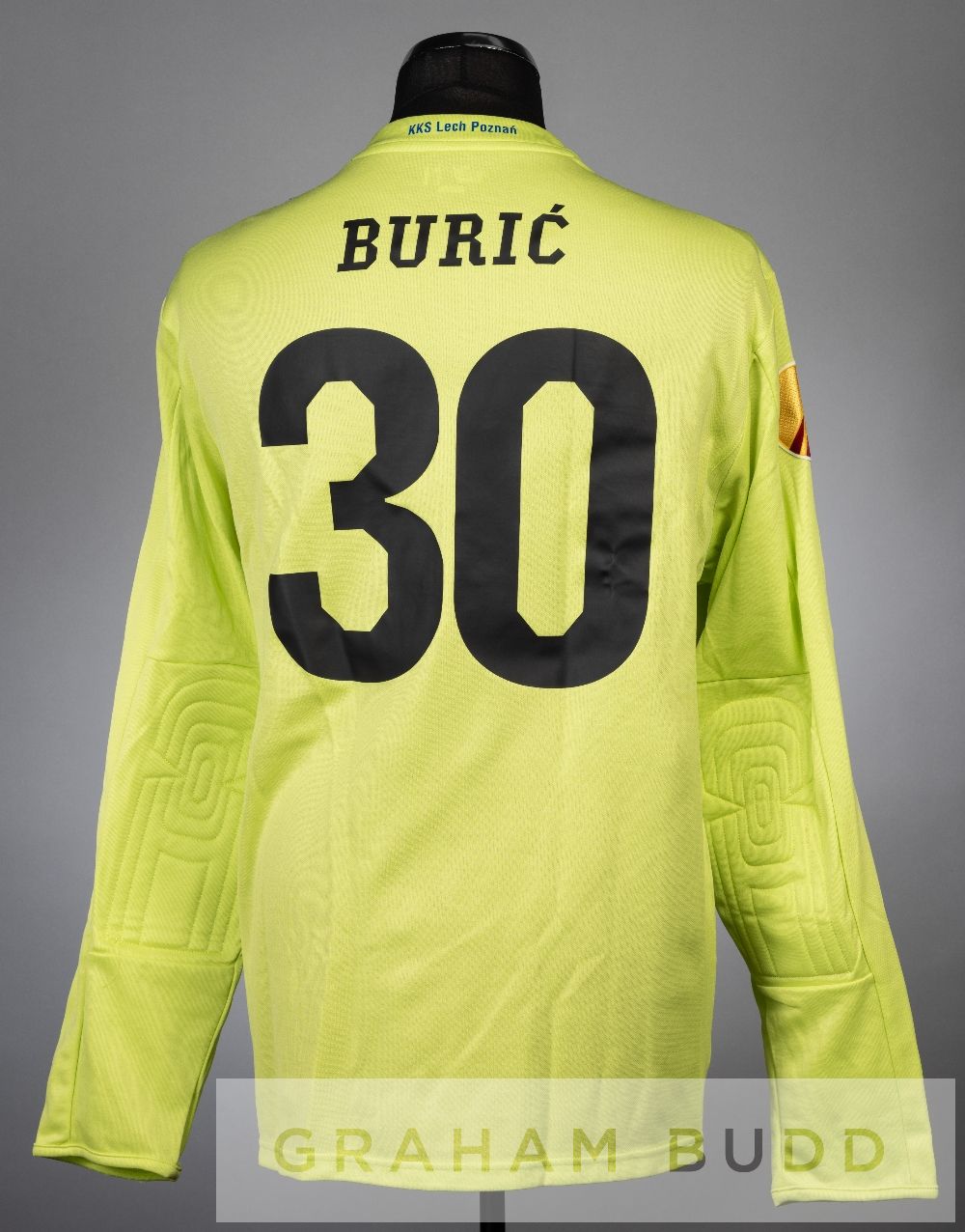 Buric lime green Lech Poznan no.30 goalkeeper's jersey v Manchester City in the UEFA Europa League Group A at City of Manchester Stadium, 21st October 2010, long-sleeved with padded elbows, UEFA EUROPA LEAGUE and RESPECT sleeve badges, club crest and sponsor logo, reverse lettered BURIC Manchester City defeated Lech Poznan 3-1, with Jasmin Buric in goal.