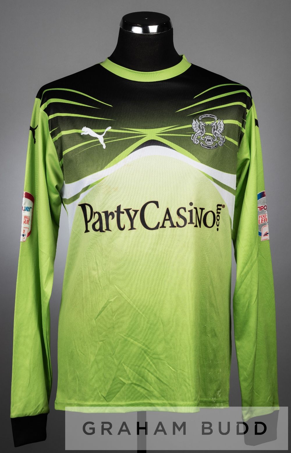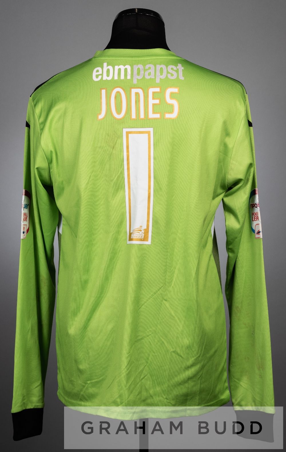 Jamie Jones lime green Leyton Orient no.1 goalkeeper's jersey v Arsenal in the FA Cup fifth round replay at Emirate Stadium, 2nd March 2011, long-sleeved with NPOWER FOOTBALL LEAGUE sleeve badges, club crest and sponsor logo, reverse lettered JONES Arsenal defeated Leyton Orient 5-0, with Jamie Jones in goal for Leyton Orient.