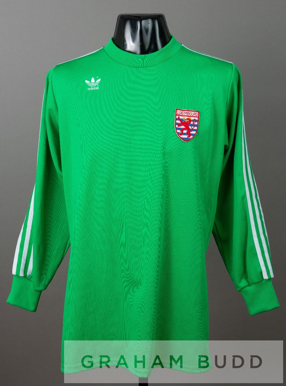 Jeannot Moes green Luxembourg no.1 goalkeeper's jersey, circa early 1980s, by Adidas, long-sleeved with padded elbows, embroidered country badge and