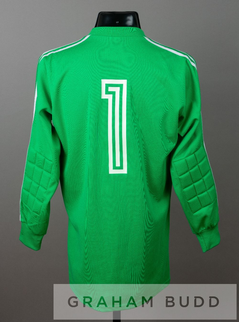 Jeannot Moes green Luxembourg no.1 goalkeeper's jersey, circa early 1980s, by Adidas, long-sleeved with padded elbows, embroidered country badge and sponsor logo, reverse numbered 1, neck label bears hand inscribed name