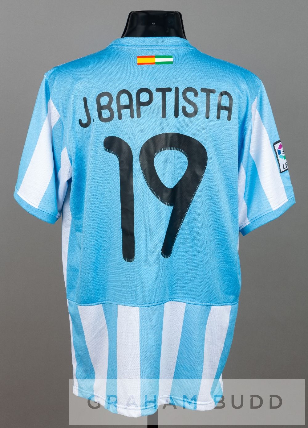 Julio Baptista blue and white striped Malaga C.F. no.19 home jersey, season 2011-12, short-sleeved with LFP sleeve badge, club crest and sponsor logo, reverse lettered J.BAPTISTA Julio Baptista played with Malaga C.F. from 2011 to 2013, making 29 appearances, scoring 14 goals.