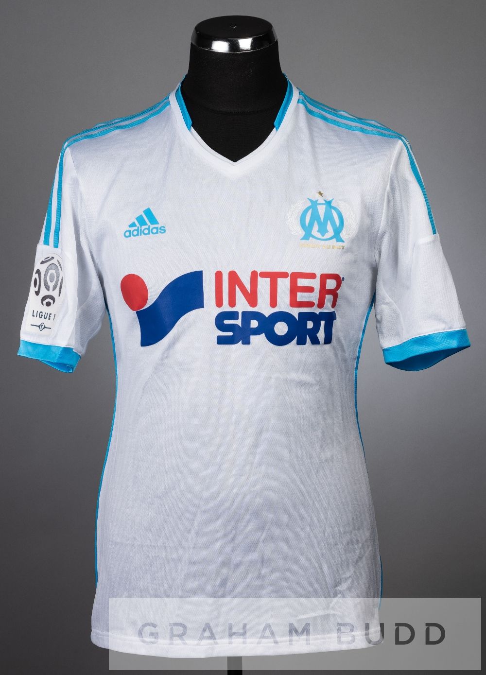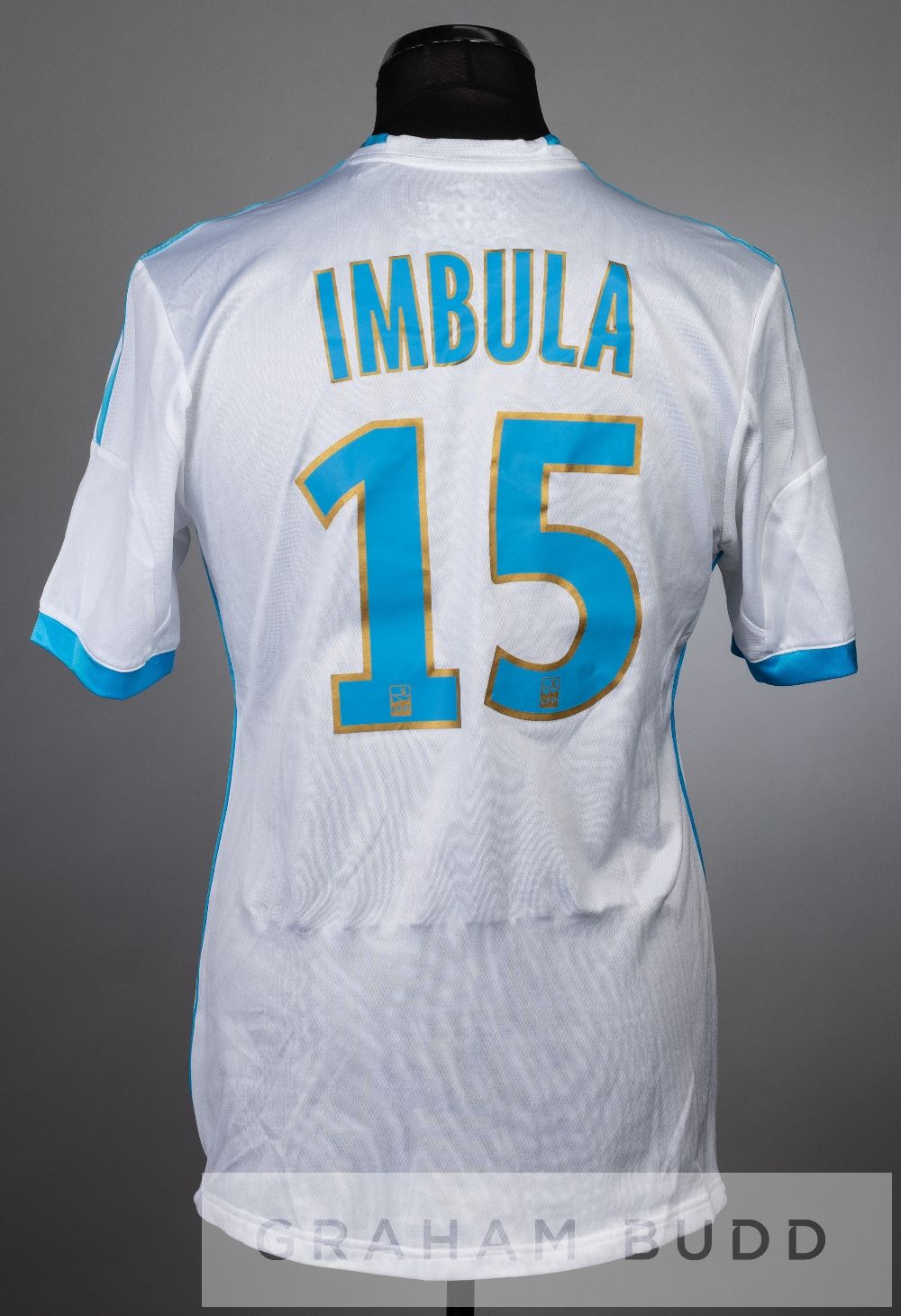 Giannelli Imbula white and blue Olympique Marseille no.15 jersey, season 2013-14, short-sleeved with LIGUE 1 sleeve badges, club crest and sponsor logo, reverse lettered IMBULA Provenance: given to the Arsenal Kitman on 18th September 2013.