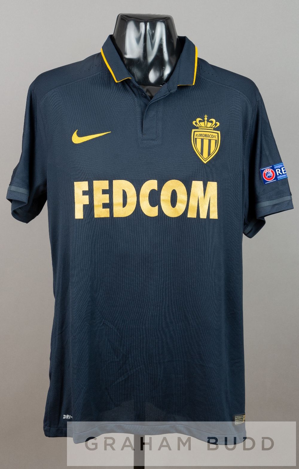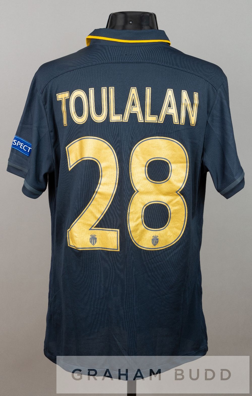 Jeremy Toulalan navy AS Monaco no.28 away jersey v Tottenham Hotspur in the UEFA Europa League Group J, at White Hart Lane, 10th December 2015, short-sleeved with UEFA EUROPA LEAGUE and RESPECT sleeve badges, club crest and sponsor logo, reverse lettered TOULALAN Tottenham Hotspur defeated AS Monaco 4-1, with Jeremy Toulalan as captain and receiving a yellow card in 74th minute.