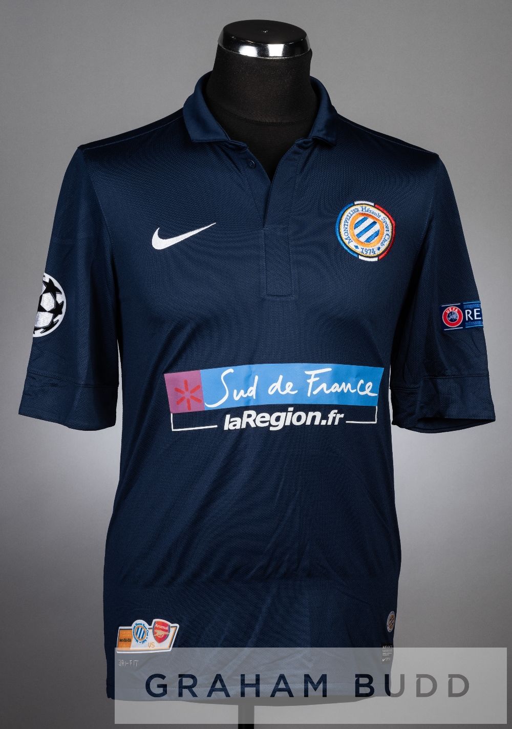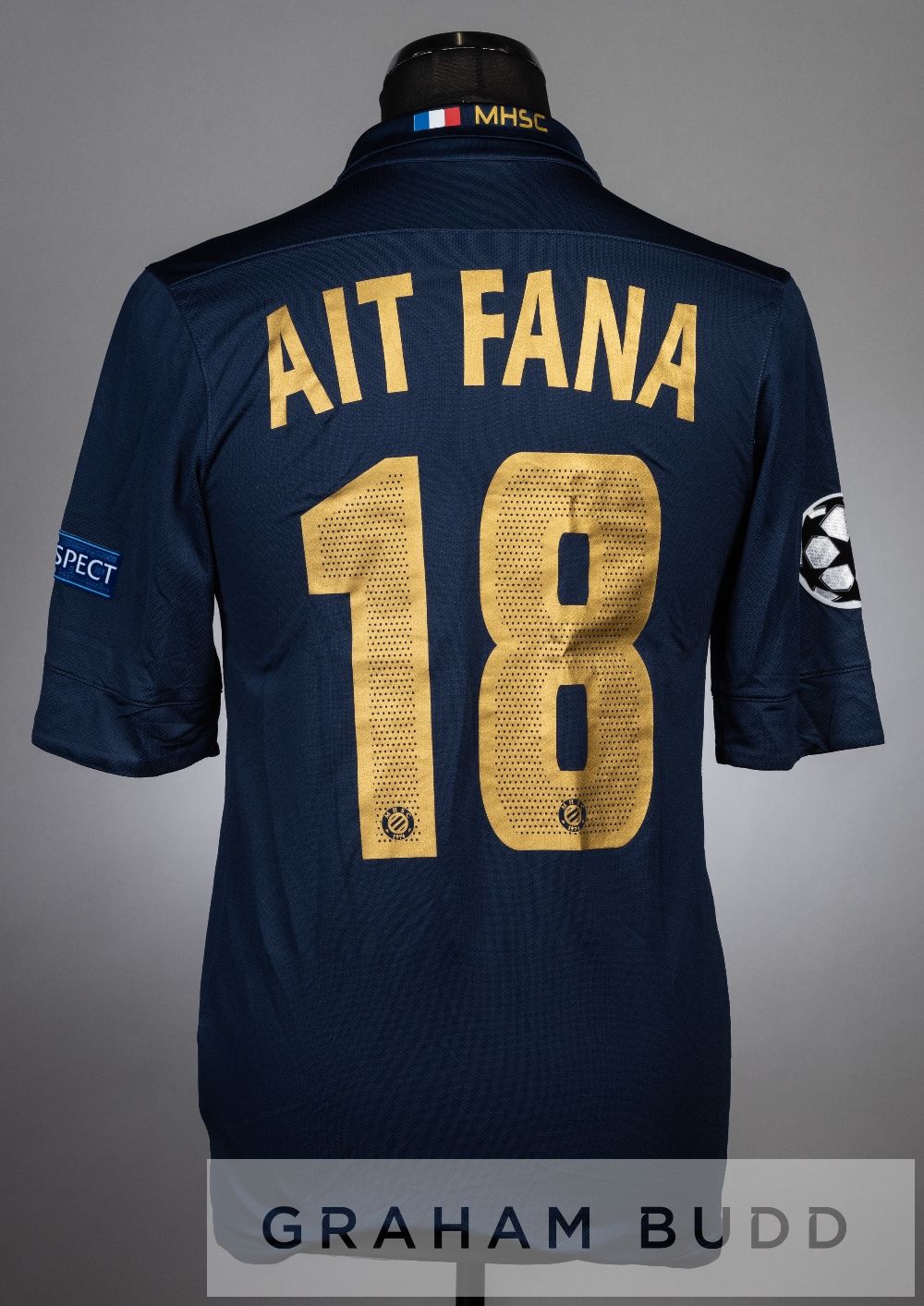 Ait Fana navy Montpellier no.18 jersey v Arsenal in the UEFA Champions League Group B, at Stade De La Mosson, 18th September 2012, short-sleeved with UEFA STARBALL and RESPECT sleeve badges, club crest and sponsor logo with special match details patch on the lower right, reverse lettered AIT FANA Arsenal defeated Montpellier 2-1, Karim Ait Fana was substituted on in the 67th minute, replacing Anthony Mounier.