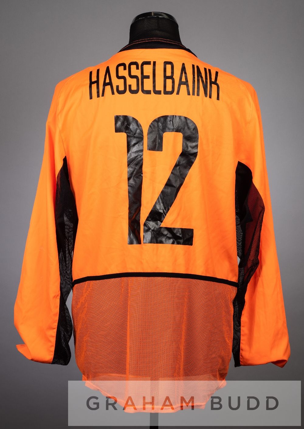 Jimmy Floyd Hasselbaink orange and black Netherlands no.12 jersey v Austria in the UEFA European Championship Group 3 at Ernst Happel Stadion, 1st October 2002, long-sleeved with club crest and sponsor logo, embroidered with country flags and 16 OKTOBER 2002, reverse lettered HASSELBAINK Netherlands defeated Austria 3-0, with Jimmy Floyd Hasselbaink substituted on in the 80th minute replacing Roy Makaay. Ernst Happel Stadion Ernst Happel Stadion Ernst Happel Stadion