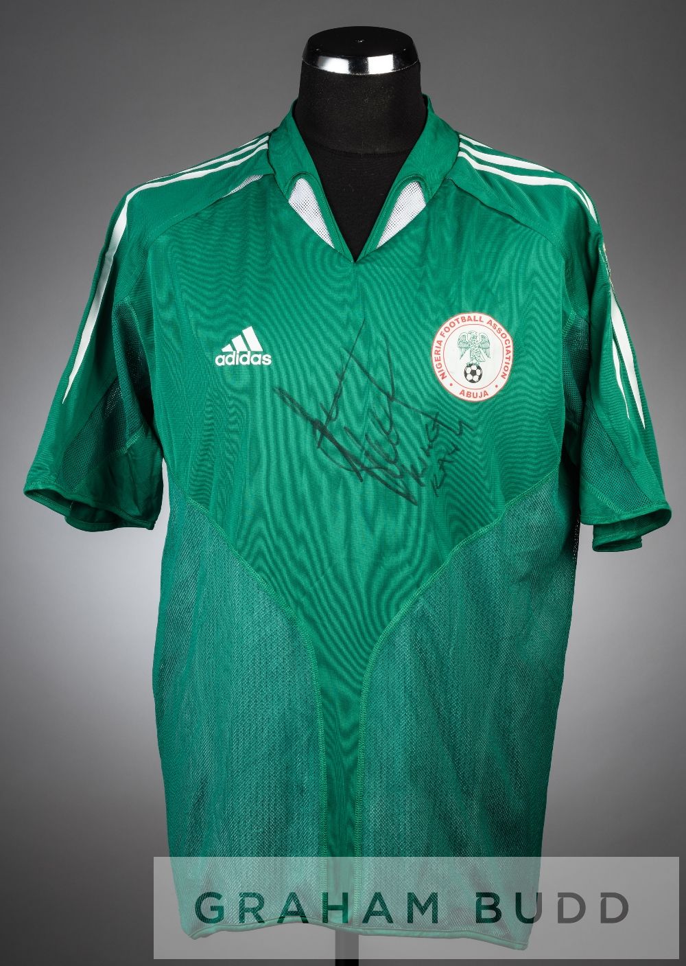 Nwankwo Kanu signed green and white Nigeria no.4 jersey, season 2004-06, short-sleeved with club crest and ADIDAS logo, reverse numbered 4, signed in black marker pen, bears remnants of sleeve badge glue, no sleeve badge present, slight glue stain to reverse near left shoulder