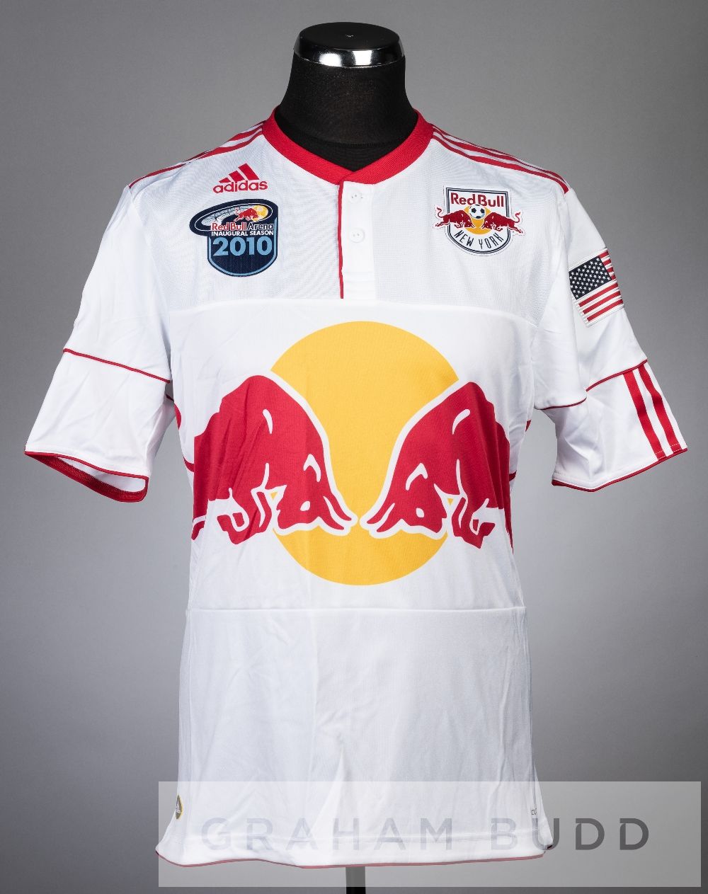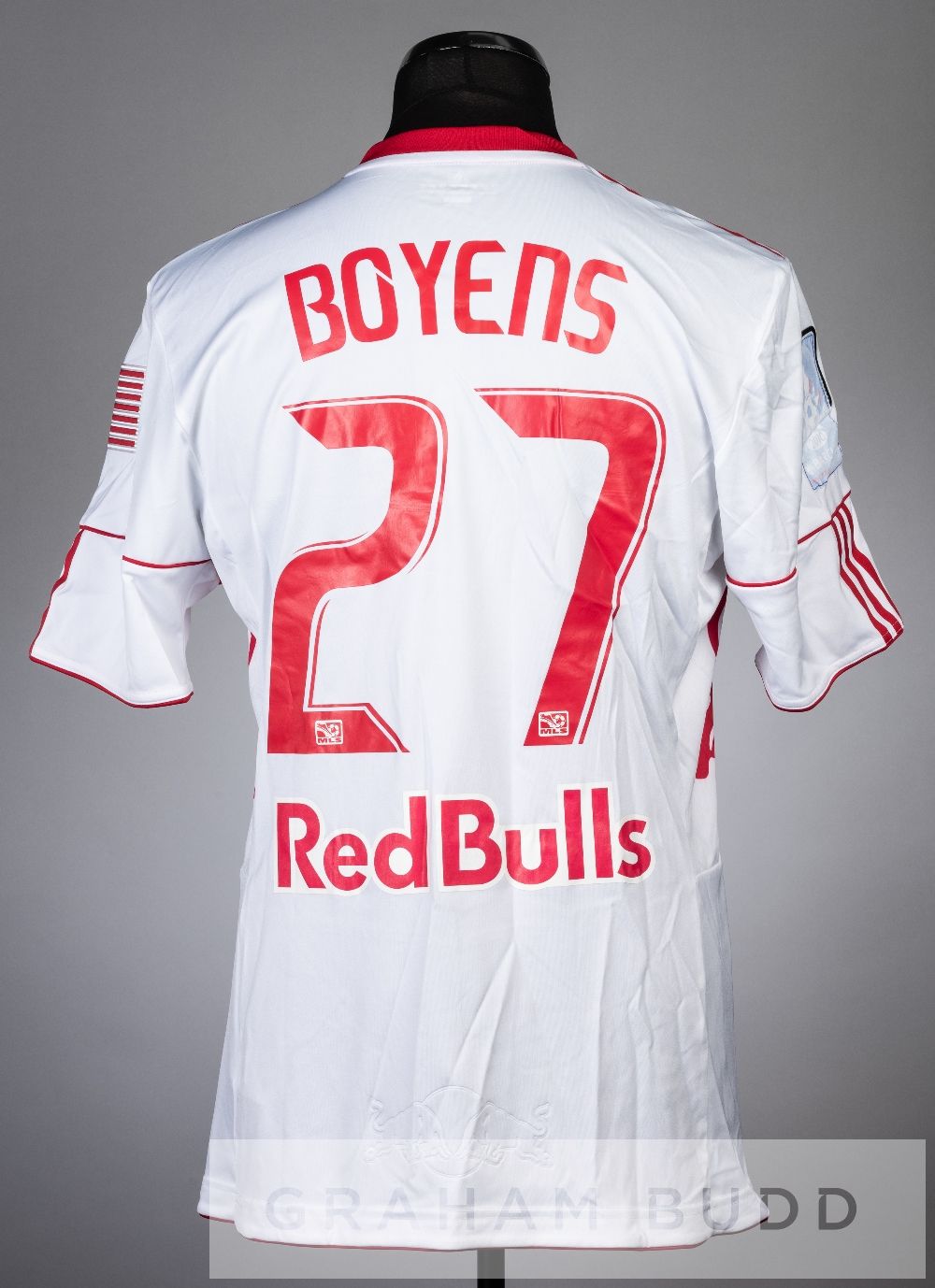 Andrew Boyens white and red New York Bulls No.27 jersey v Manchester City in the Barclays Challenge tournament in Red Bull Arena, 25th July 2010, short-sleeved with American flag and 2010 BARCLAYS NEW YORK CHALLENGE sleeve badges, club crest and sponsor logo, reverse lettered BOYENS New York Red Bulls defeated Manchester City 2-1, with Andrew Boyens being substituted on.