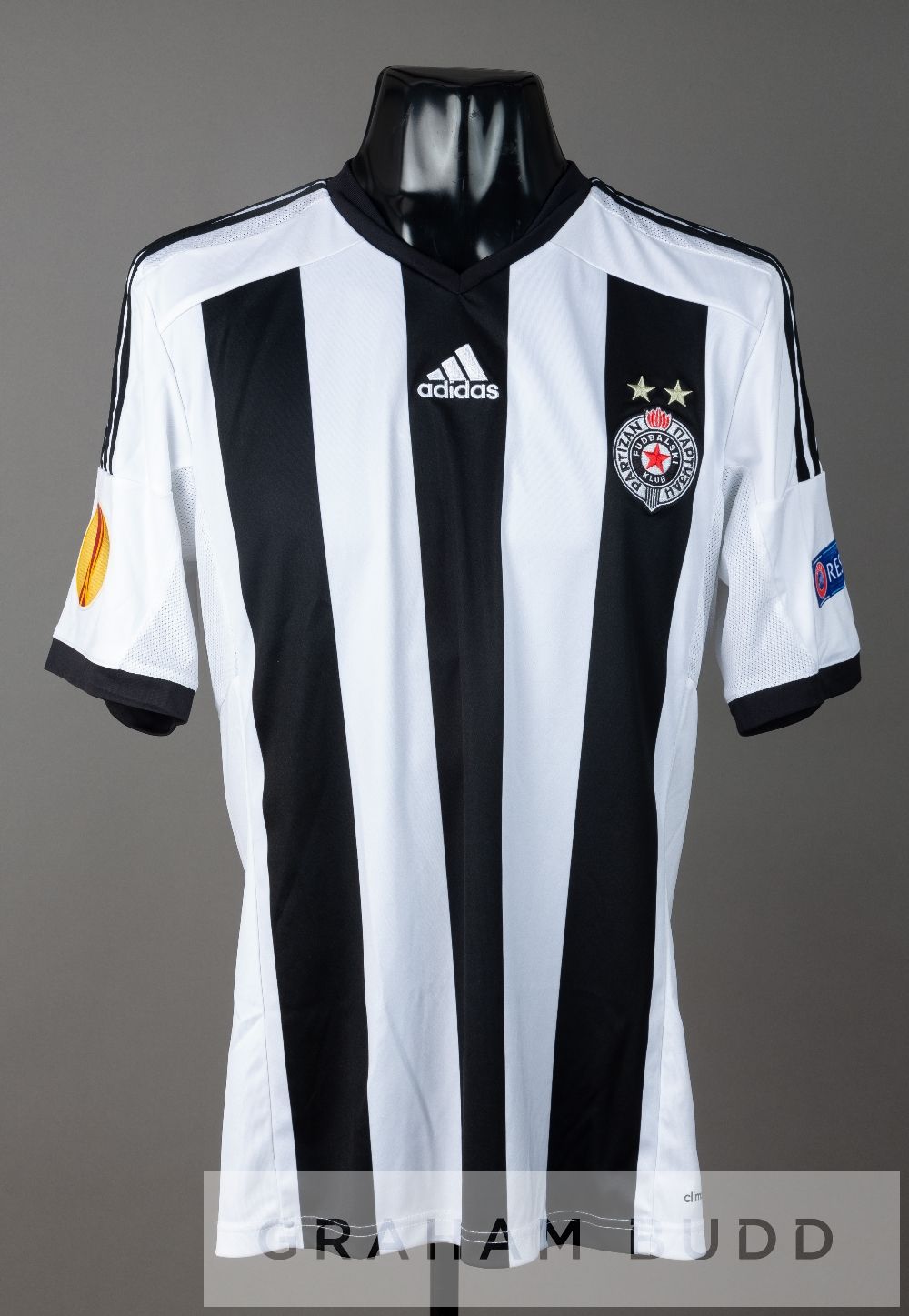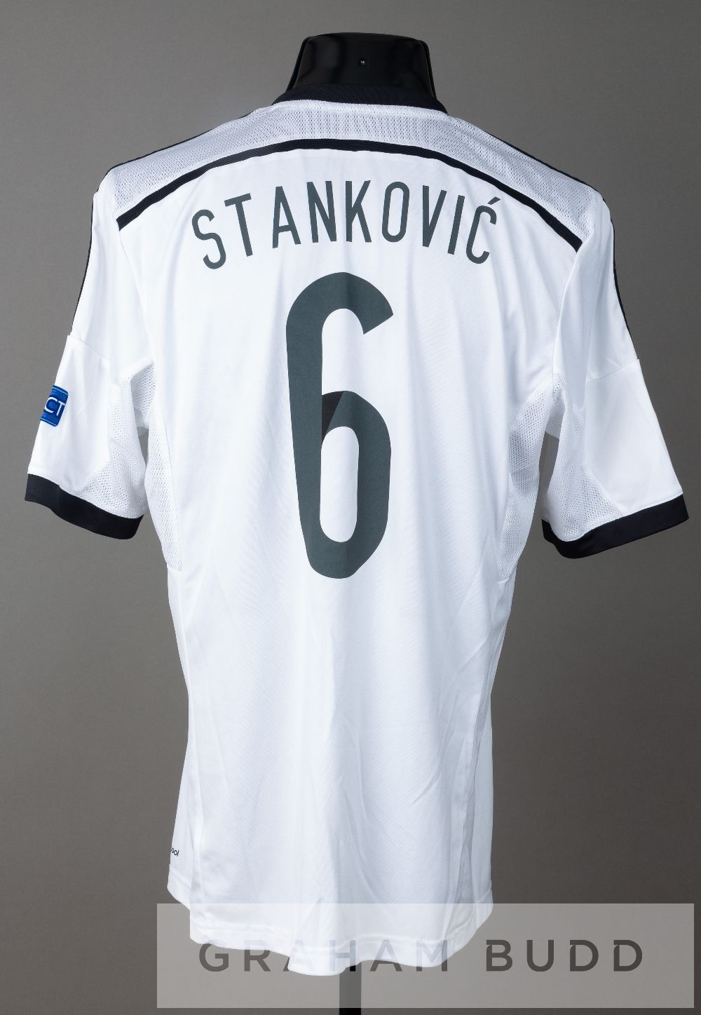 Vojislav Stankovic white and black Partizan Belgrade no6 jersey v Tottenham Hotspur in the UEFA Europa League Group C at FK Partizan, 18th September 2014, short-sleeved with UEFA EUROPA LEAGUE and RESPECT sleeve badges, club crest and sponsor logo, reverse lettered STANKOVIC This fixture resulted in a 0-0 draw, with Vojislav Stankovic playing in defence.