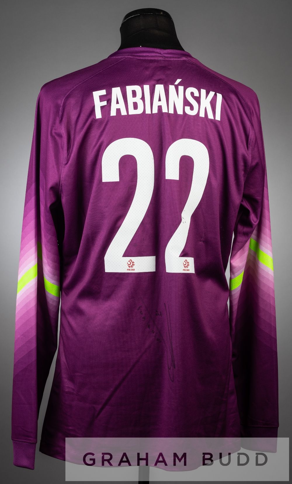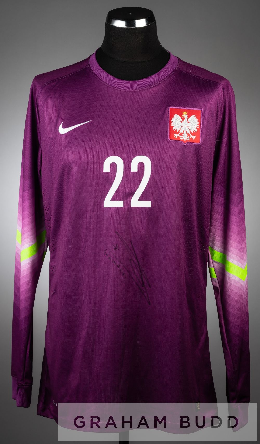 Lukasz Fabianski purple Poland no.22 goalkeeper's jersey, 2000s, long-sleeved with country emblem badge, NIKE logo, reverse lettered FABIANSKI, bears black mark in the white number 22 on reverse possibly transposed from jersey lettering Re-catalogued under item 38 for March 2022 GB46