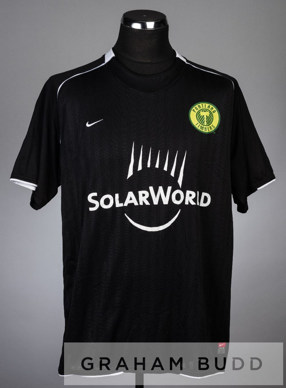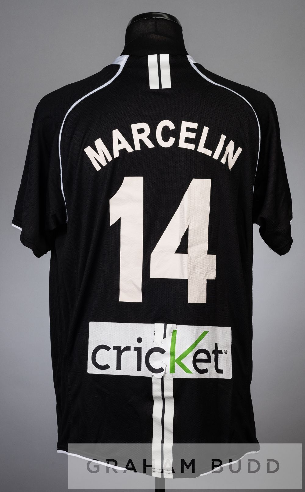 James Marcelin black and white Portland Timbers no.14 home jersey v Manchester City on USA Tour at Metro Field, Portland, 18th July 2010, short-sleeved with club crest and sponsor logo, reverse lettered MARCELIN Manchester City defeated Portland Timbers 3-0.