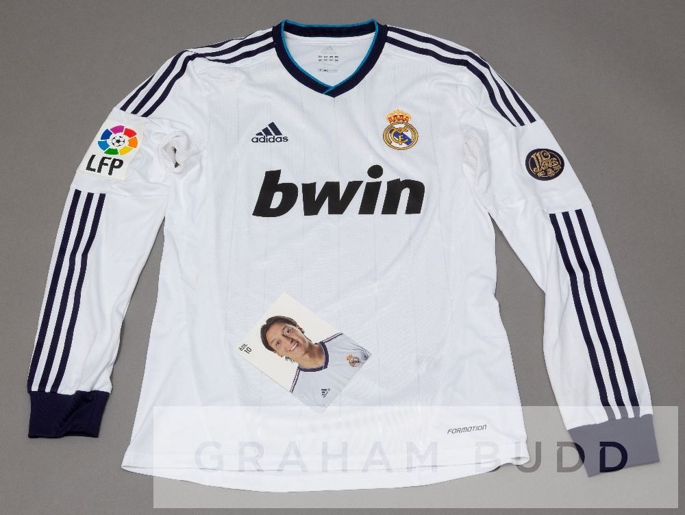 Mesut Ozil white Real Madrid No.10 home jersey worn in the La Liga match v RCD Mallorca 28th October 2012, long-sleeved with LA LIGA LFP and REAL MADRID 100 YEAR ANNIVERSARY 1902-2012 sleeve badges, club crest and sponsor logo, reverse lettered OZIL, with player photographic postcard and MWS Spain Soccer COA, the jersey bears staining to right elbow and body and left sleeve, some material piling Mesut Ozil played for Real Madrid from 2010 to 2013, making 105 appearances scoring 19 goals. The COA in this lot confirms that the shirt was match worn in the Mallorca game.