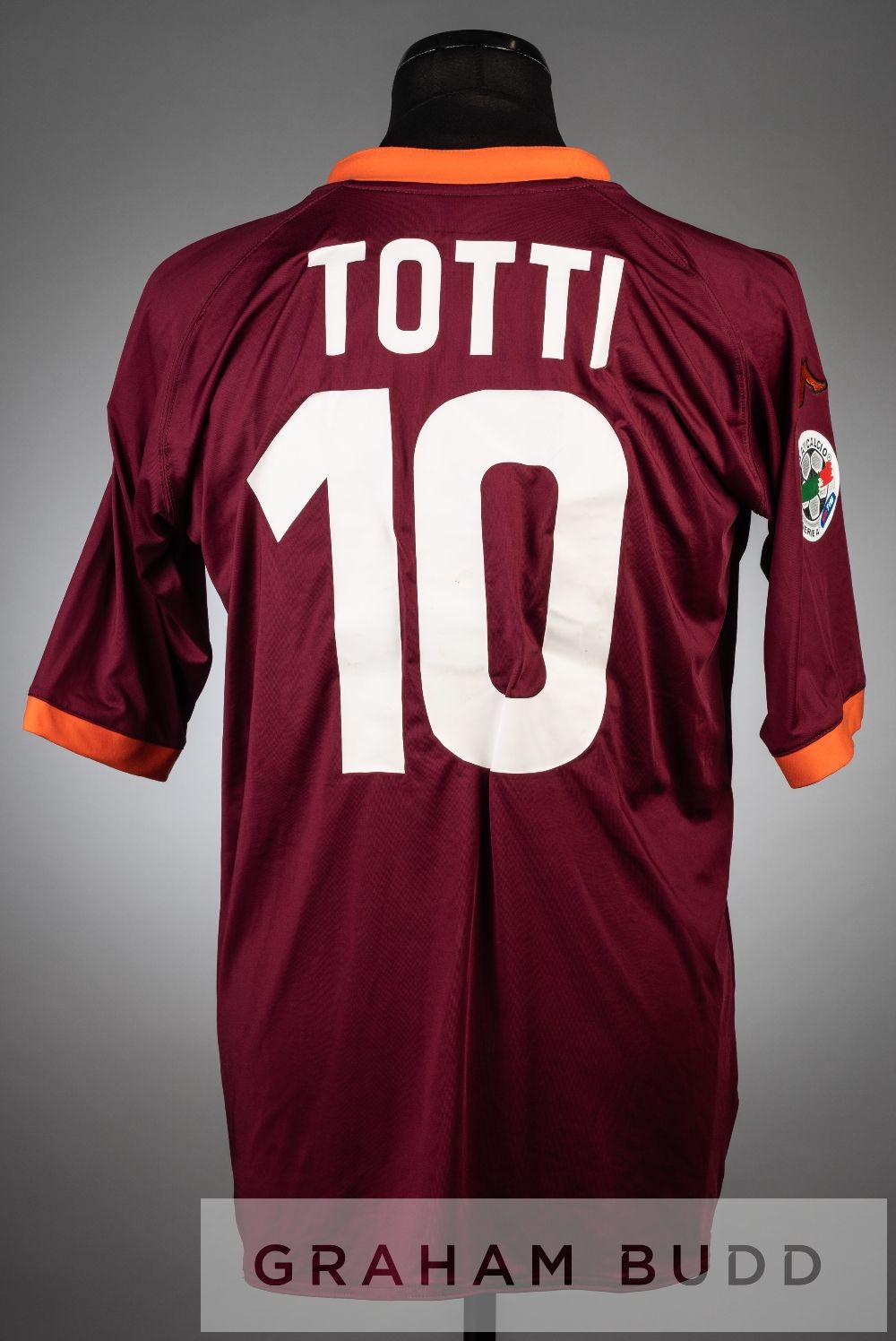 Francesco Totti claret and orange AS Roma no.10 home jersey, season 2007-08, short-sleeved with LEGA CALCIO SERIE A sleeve badge, club crest and sponsor logo, reverse lettered TOTTI