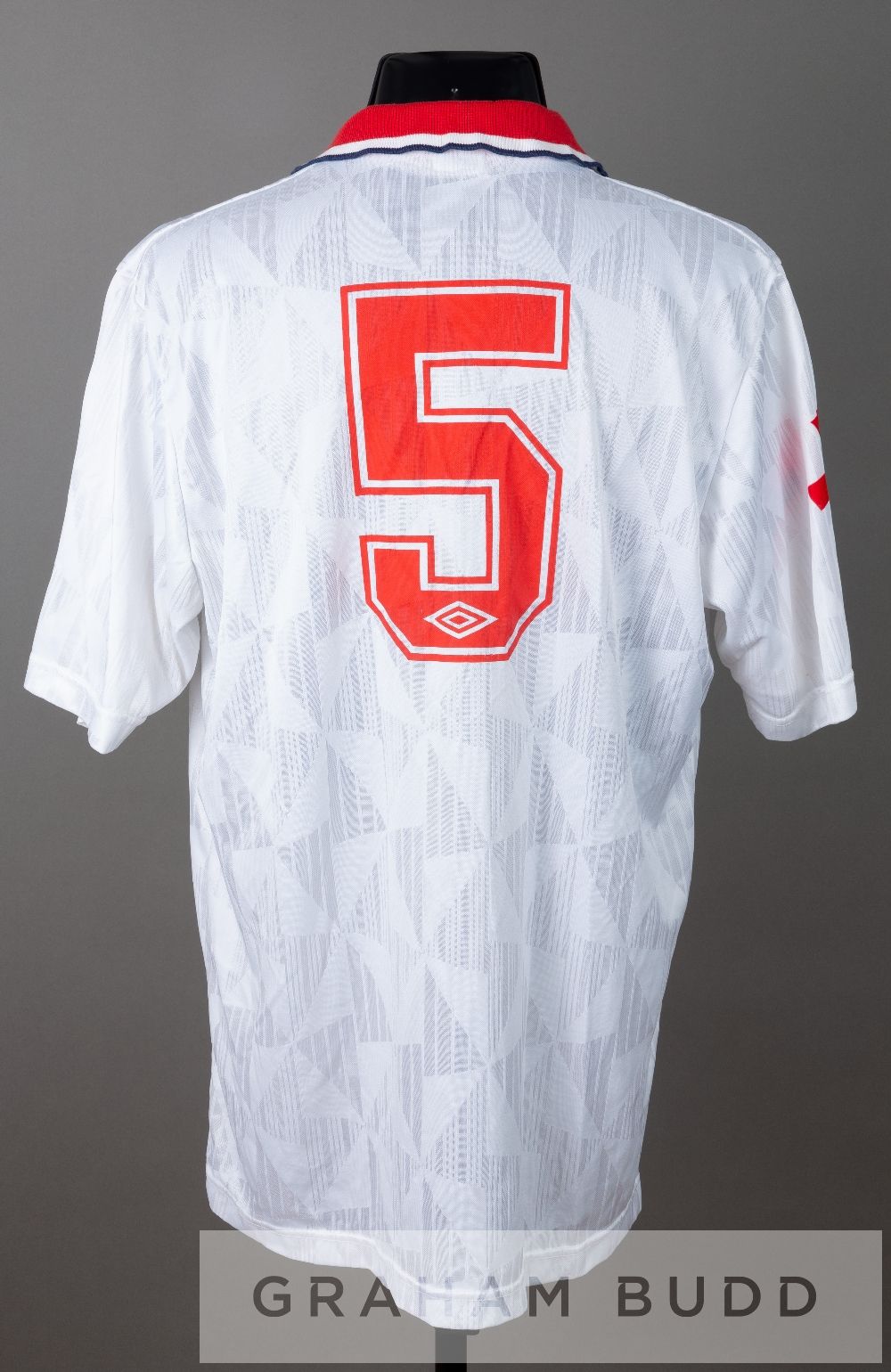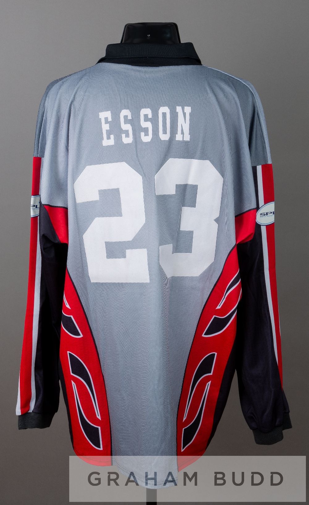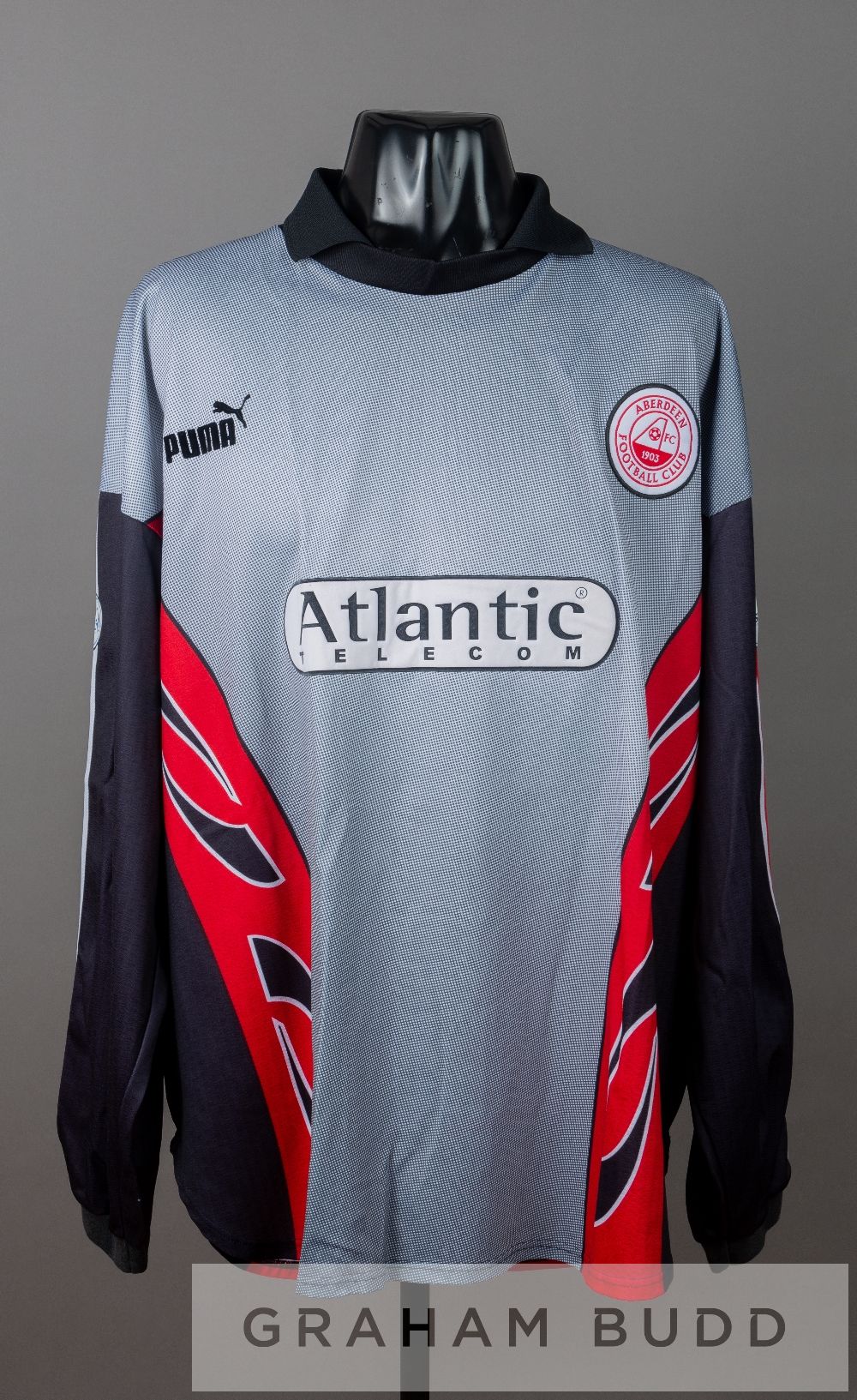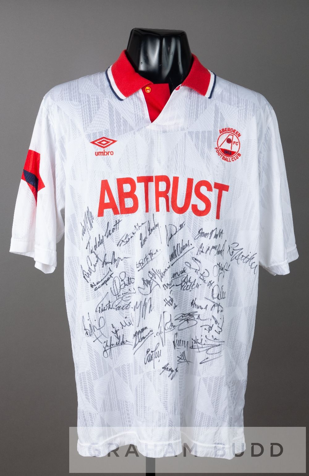 Squad signed white and red Aberdeen no. 5 away jersey, circa 1991 and a Ryan Esson no.23 goalkeeper's jersey, season 1999-2000, by Umbro, short-sleeved, embroidered club crest ABERDEEN FOOTBALL CLUB, with sponsor logo, reverse numbered 5, signed in black marker pen by approximately 37 squad members including Alex McLeish, Jim Bett, Bobby Connor, Gary Smith, Eoin Jess, Theo ten Caat, David Winnie, Teddy Scott, and others; sold with a Ryan Esson Aberdeen no.23 goalkeeper's jersey, season 1999-2000, by Puma, long-sleeved with club crest and sponsor logo, reverse lettered ESSON, (2) The style of first jersey was used between 1990 and 1992. If it dates from the 1990-91 season the player Alex McLeish. If it dates from the 1992-93 seasons it is more likely to be Brian Irvine, as McLeish was injured for the majority of the season, making just very few appearances.