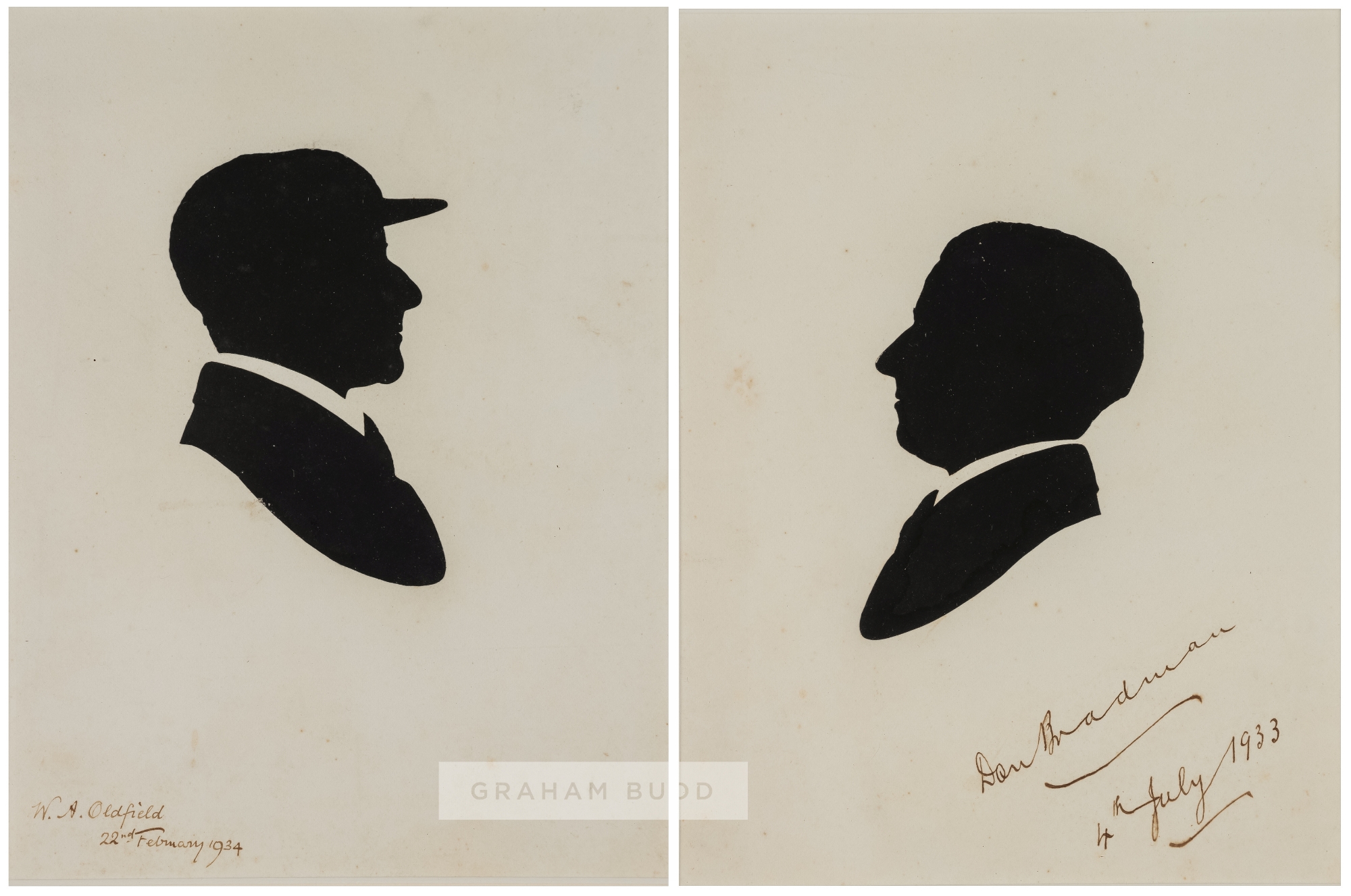 Australian cricketers Don Bradman and Bert Oldfield signed portrait silhouettes, the first depicting Don Bradman facing left, signed and dated 4th J