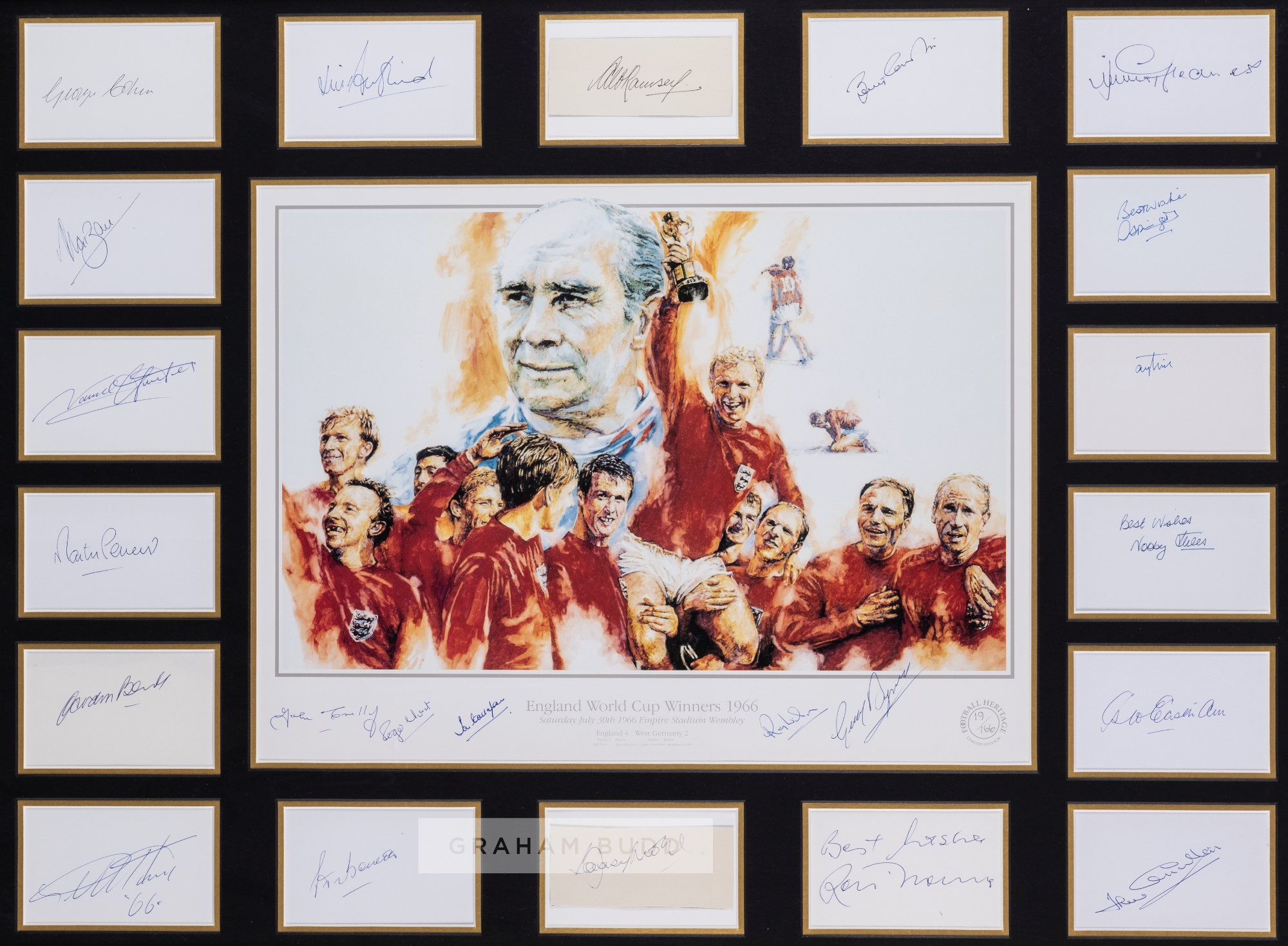 England 1966 World Cup winners' autographed montage, centrally mounted with a limited edition print depicting the triumphant scenes at Wembley stadium, signed to the lower margin by John Connolly, Roger Hunt, Ian Callaghan, Ray Wilson, Gerry Byrne, the print surrounded by white and cream card signed by all the remaining players in the 22 man squad and additionally by Alf Ramsey, mounted, glazed and framed, 70 by 90cm. Please be aware all glass will be removed from framed and glazed items prior to posting and may result in delays to shipping your items. (This service is included in the cost of postage and packing). We can also totally remove all framing and mounts upon request to reduce shipping costs. Alternatively lots can be collected in person by prior appointment from NN8 1RT.