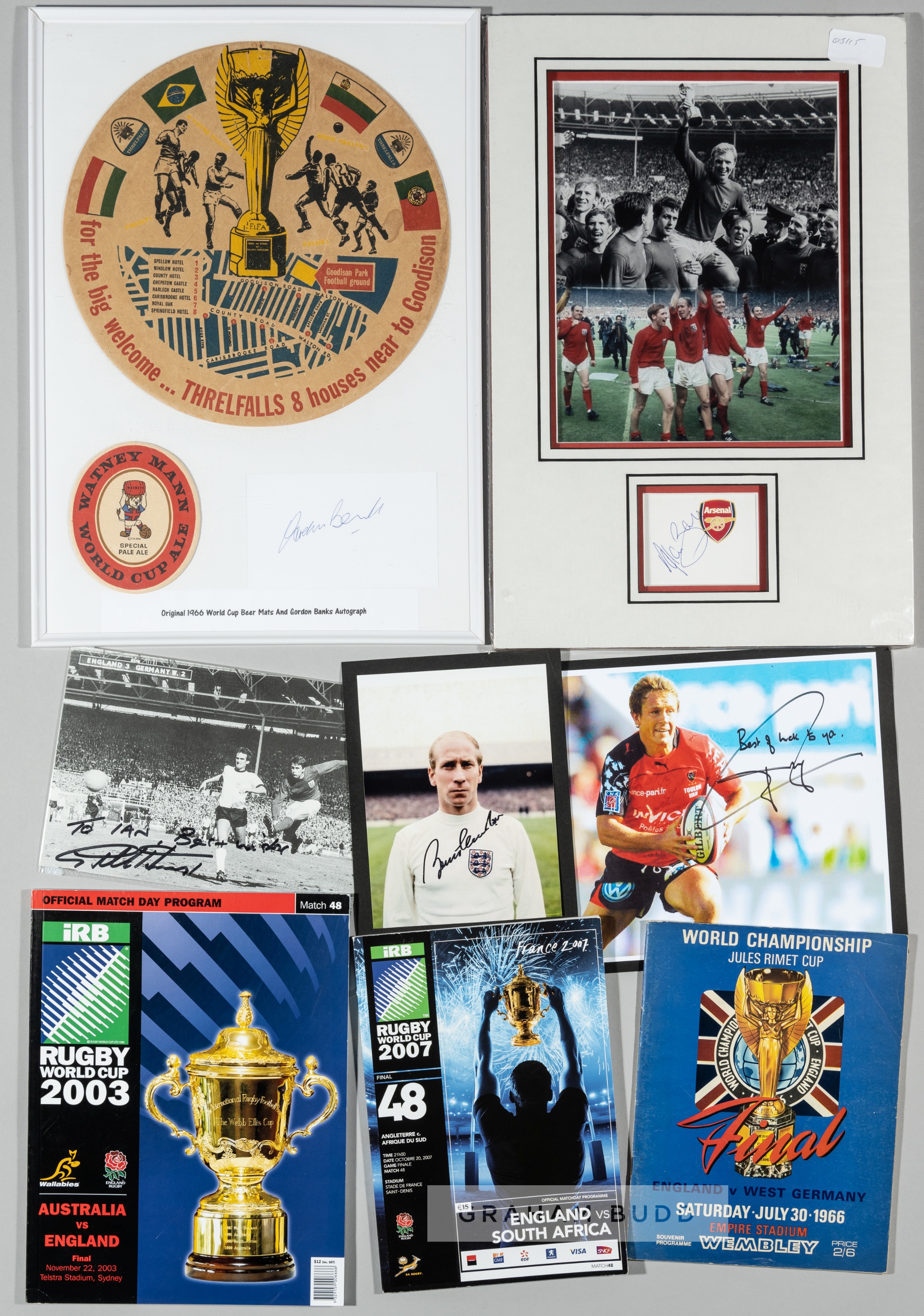Collection of England 1966 World Cup and Rugby 2003 World Cup memorabilia, including prints signed by Gordon Banks, Alan Ball and Nobby Stiles, photograph signed by Geoff Hurst, Bobby Charlton, programmes, tickets, collectors badges and cards, souvenir newspapers, magazines and other publications; the lot also includes a group of memorabilia to the England 2003 Rugby World Cup winners, including a print signed by Uncle and Nephew George and Ben Cohen, autobiographies with signatures of Wilkinson, Dallaglio, Robinson and Moody, plus a Neil Back signed publicity card, Martin Johnston dvd cover, Jonathan Webb signed publicity card, Wilkinson signed photograph plus final programmes and four programmes from the 1991 World Cup, (qty)