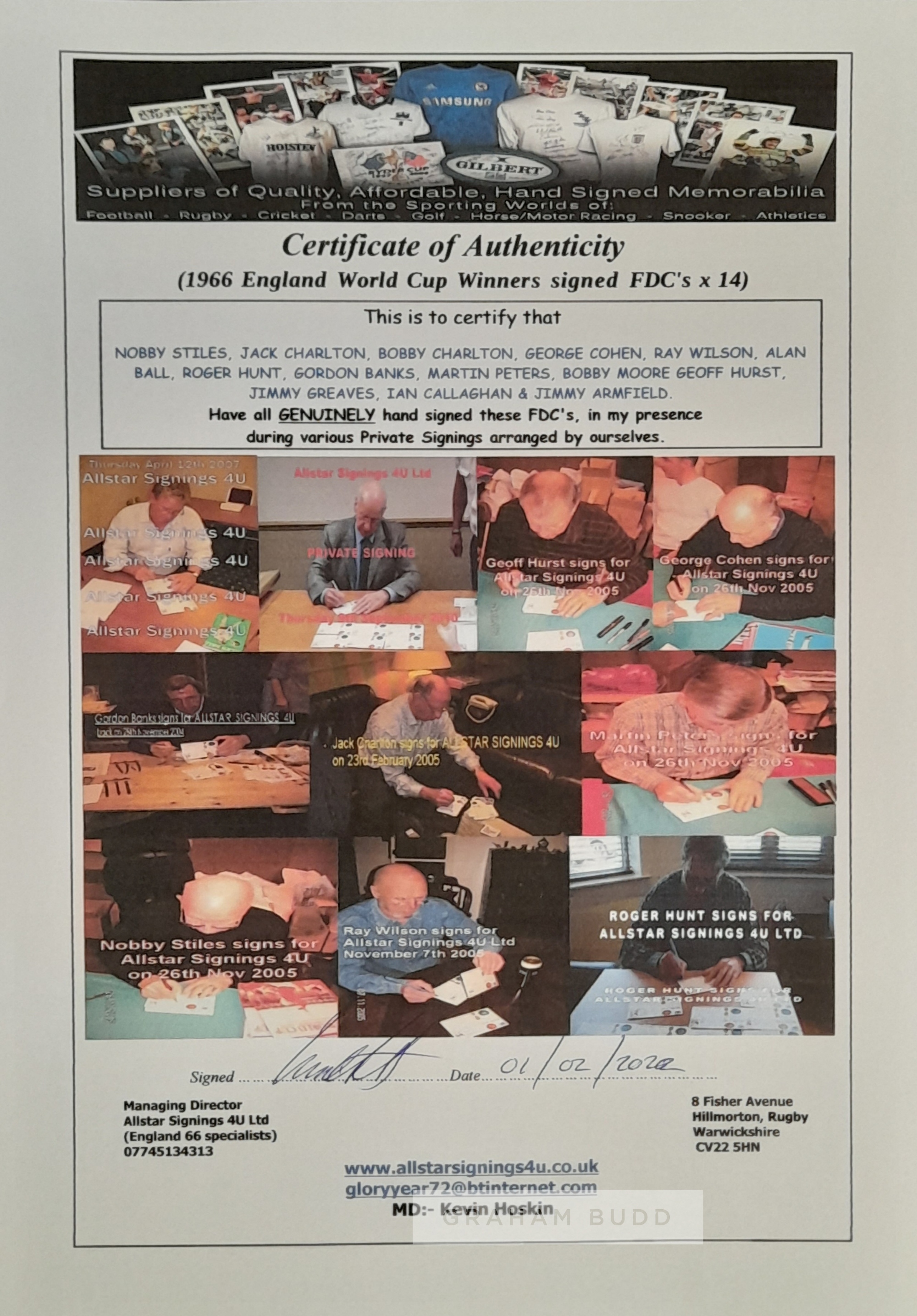 England 1966 World Cup winners signed Rembrandt FDC with the 4d England Winners stamp franked Harrow And Wembley 18 AUG 1966 First Day Of Issue, autographed by all 11 players who defeated West Germany at Wembley back on 30th July 1966 along with three extra squad players, hand signed in biro by Gordon Banks, Ray Wilson, George Cohen, Bobby Moore (c), Jack Charlton, Alan Ball, Bobby Charlton, Nobby Stiles, Martin Peters, Roger Hunt, Geoff Hurst, Jimmy Greaves, Jimmy Armfield and Ian Callaghan, comes with COA and photo proof