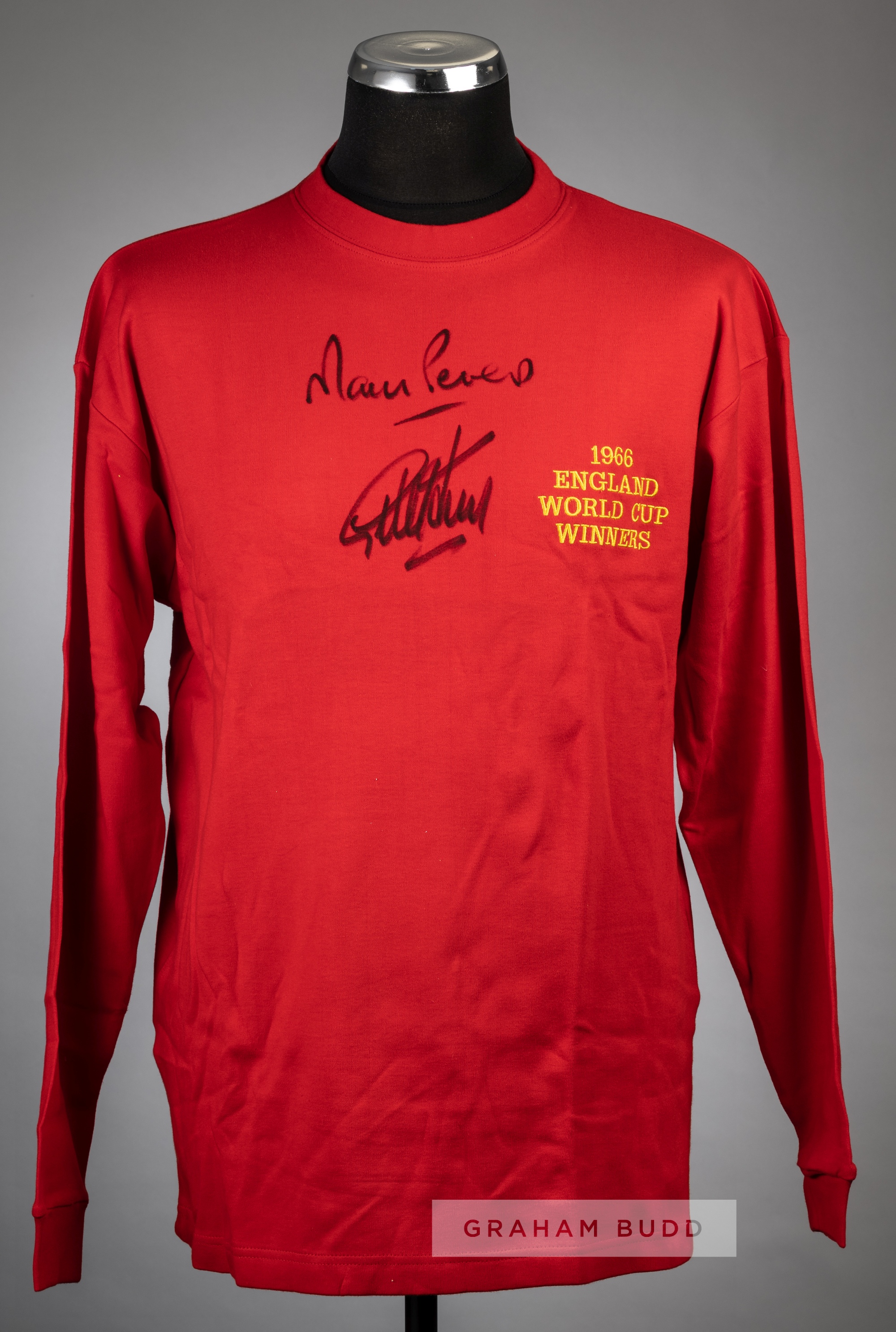 Geoff Hurst & Martin Peters signed red 1966 England World Cup Winners retro jersey, signed in black marker pen on front, with Sporting Legends COA, s