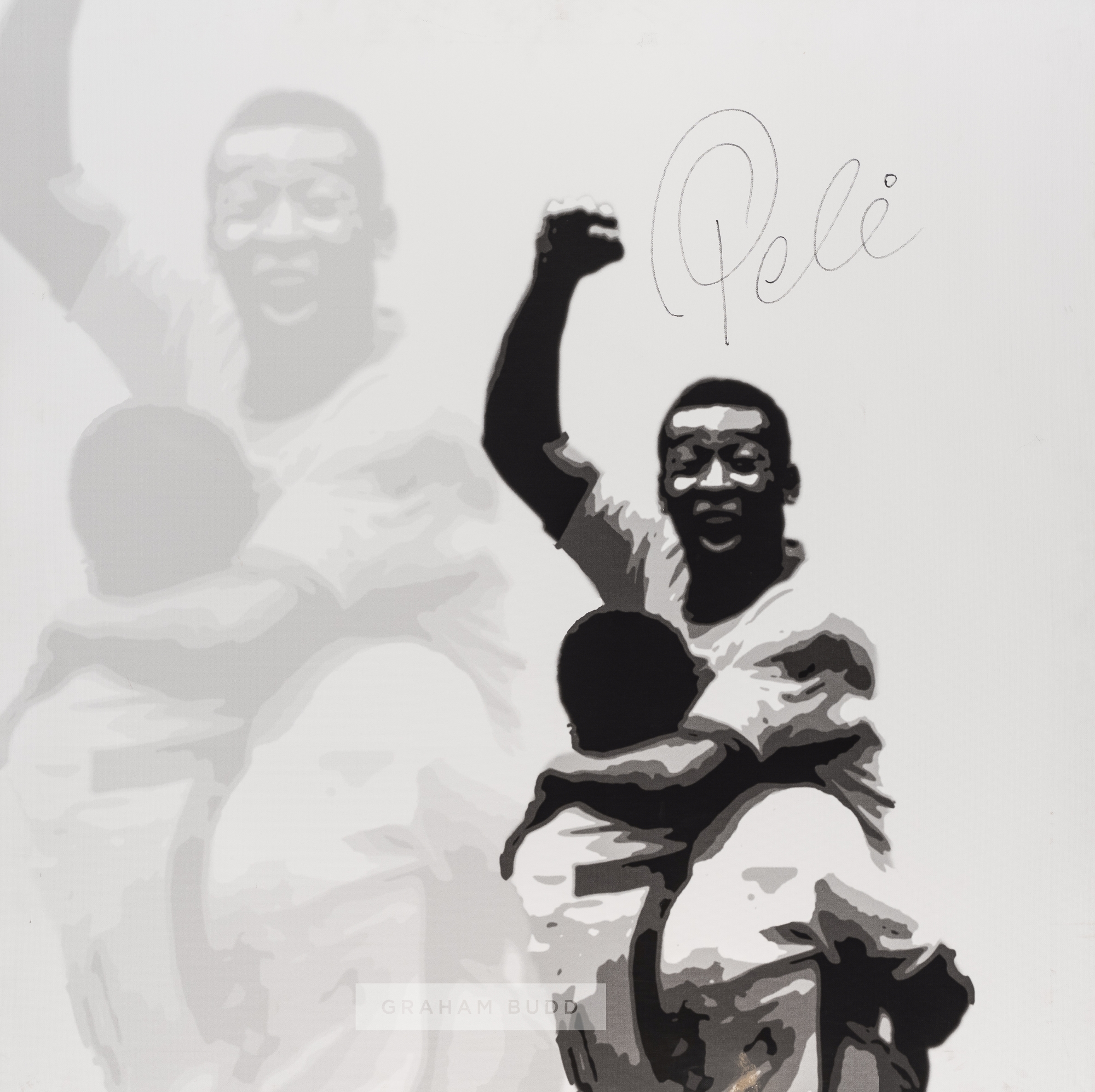 A Pele signed print on canvas featuring his iconic goal celebration image from the 1970 World Cup, signed in black marker pen, large and impressive, stretched but unframed, 96.5cm., 38in. square; sold together with a COA incorporating a photograph of Pele at the signing, (2)