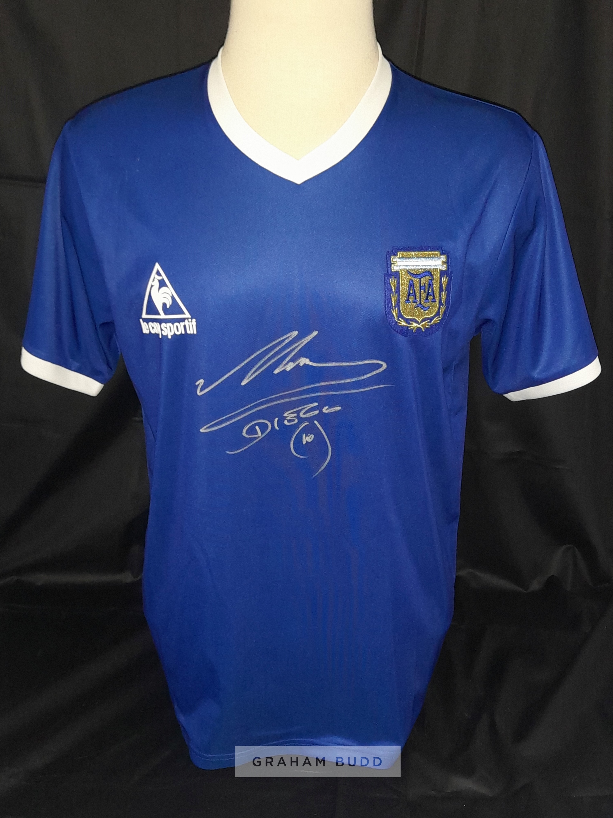 Maradona signed replica of the 1986 World Cup “THE HAND OF GOD” jersey against England, autographed to front by arguably one of the World's greatest ever footballers, name and number to reverse, Diego also scored “the goal of the century” against England during the same match, Argentina would go onto lift the trophy after beating West Germany 3-2, Maradona was the Golden Ball winner as player of the tournament, comes with COA