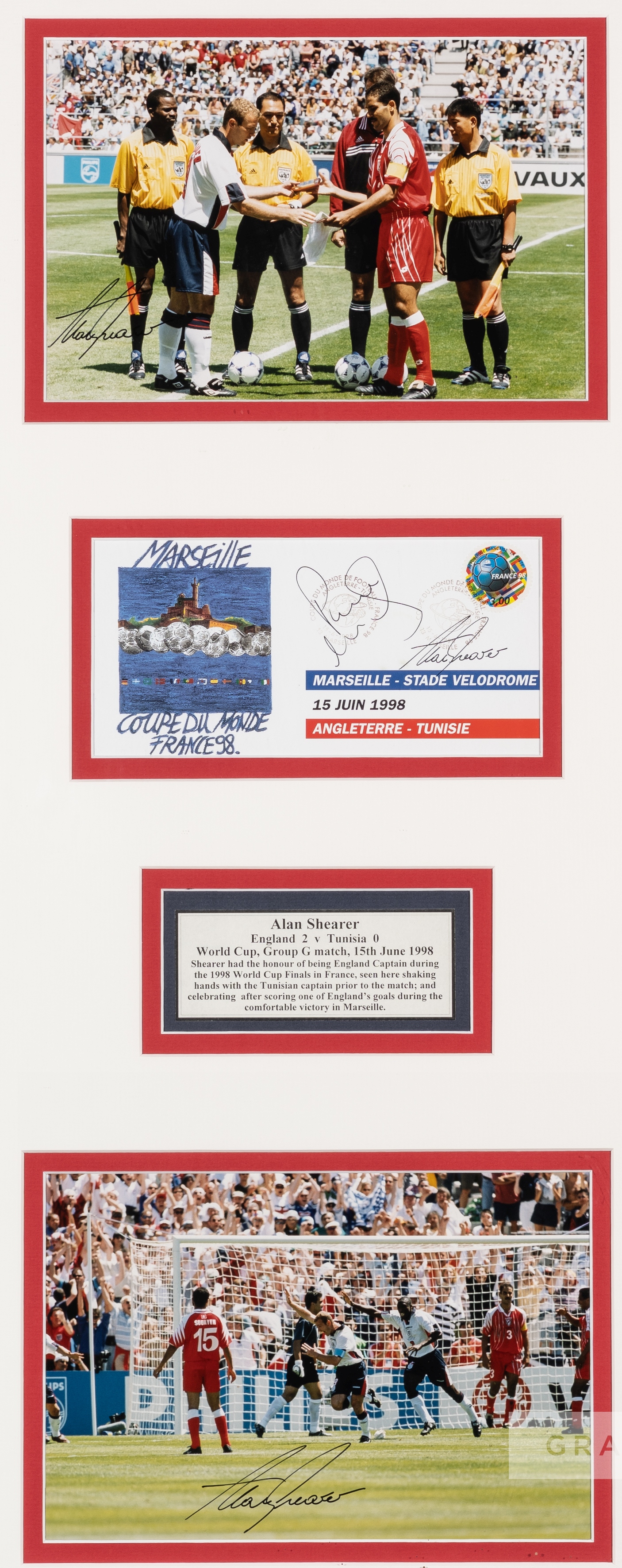 Alan Shearer signed photographs & first day cover for the FIFA World Cup Group G qualifier England v Tunisia, played in Marseille, 15th June 1998, two colour photographs of Alan Shearer prior to the match start and after scoring his goal, both signed in black marker pen, with signed first day cover and typed legend, all four mounted in one glazed frame, overall 85 by 41cm. England defeated Tunisia 2-0. Please be aware all glass will be removed from framed and glazed items prior to posting and may result in delays to shipping your items. (This service is included in the cost of postage and packing). We can also totally remove all framing and mounts upon request to reduce shipping costs. Alternatively lots can be collected in person by prior appointment from NN8 1RT.