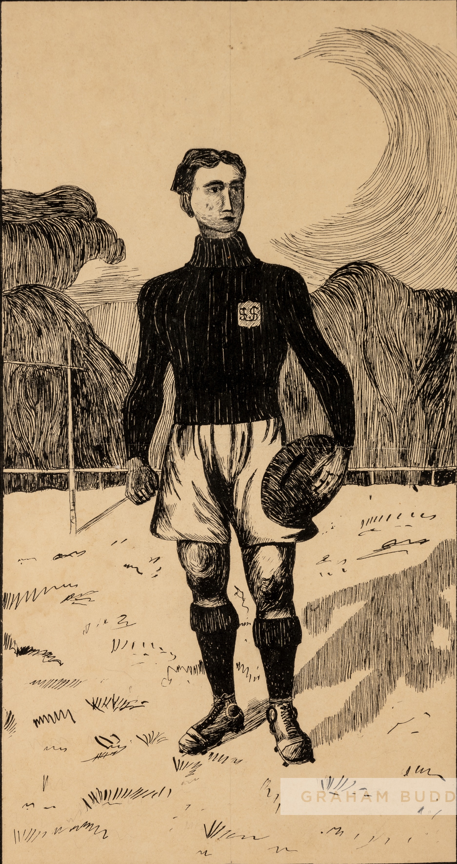 A pen and ink drawing of a European rugby player, circa 1920s, depicting the rugby player in match kit holding a rugby ball in front of the posts, th